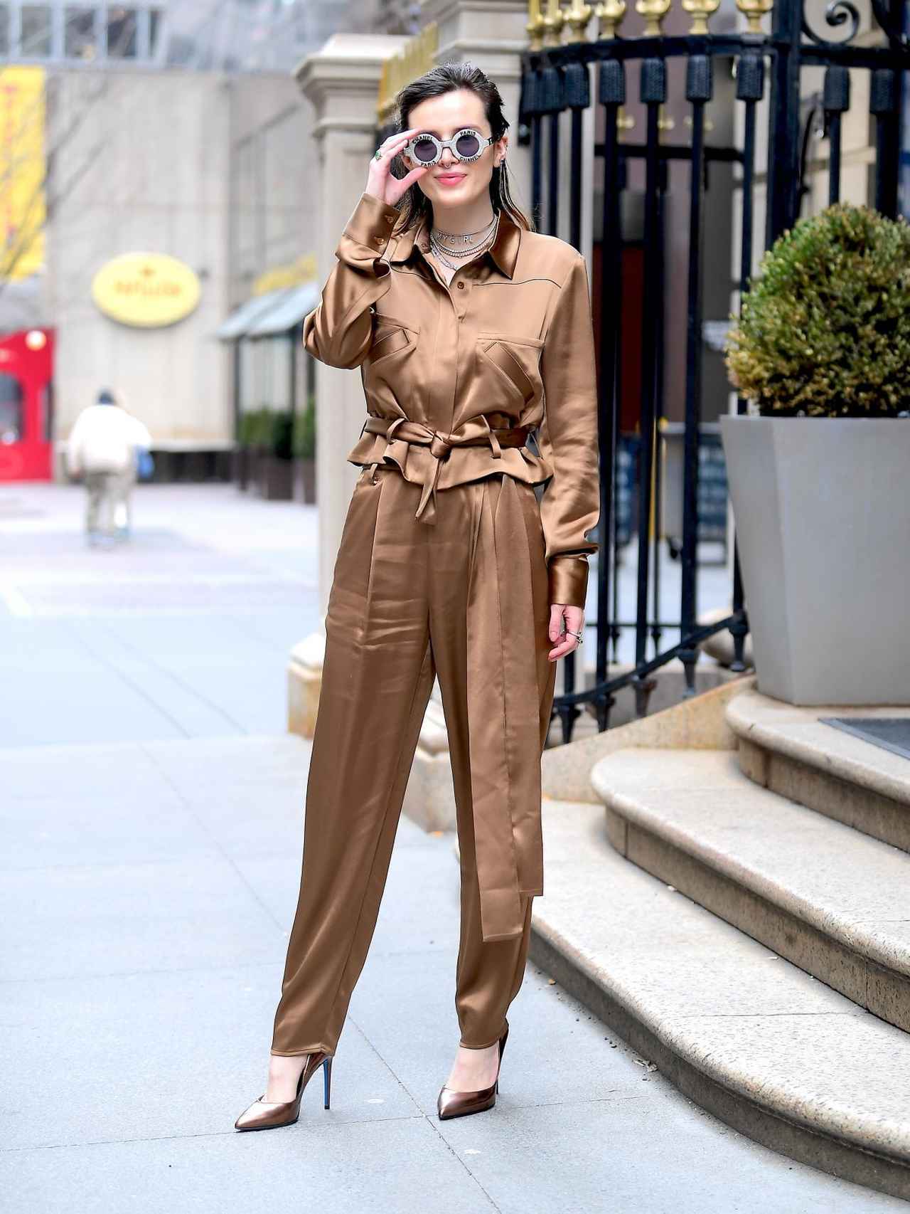 人気が続くセットアップも今年はサテンが新顔。シンガーのベラ・ソーンは、サテンのセットアップにブロンズブラウンのパンプスを合わせてクールに仕上げて。