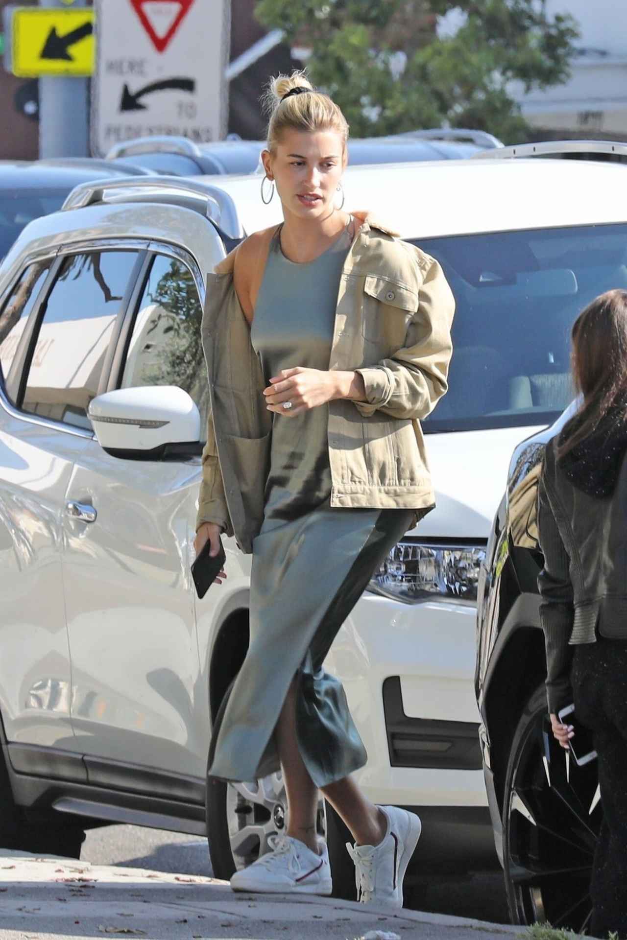 世界的シンガーのジャスティン・ビーバーと結婚して話題のモデル、ヘイリー・ビーバーは、ミリタリーグリーンのサテンワンピにオーバーサイズのミリタリージャケットでカラーを統一し、素材感の違いで印象づけたスタイリング。