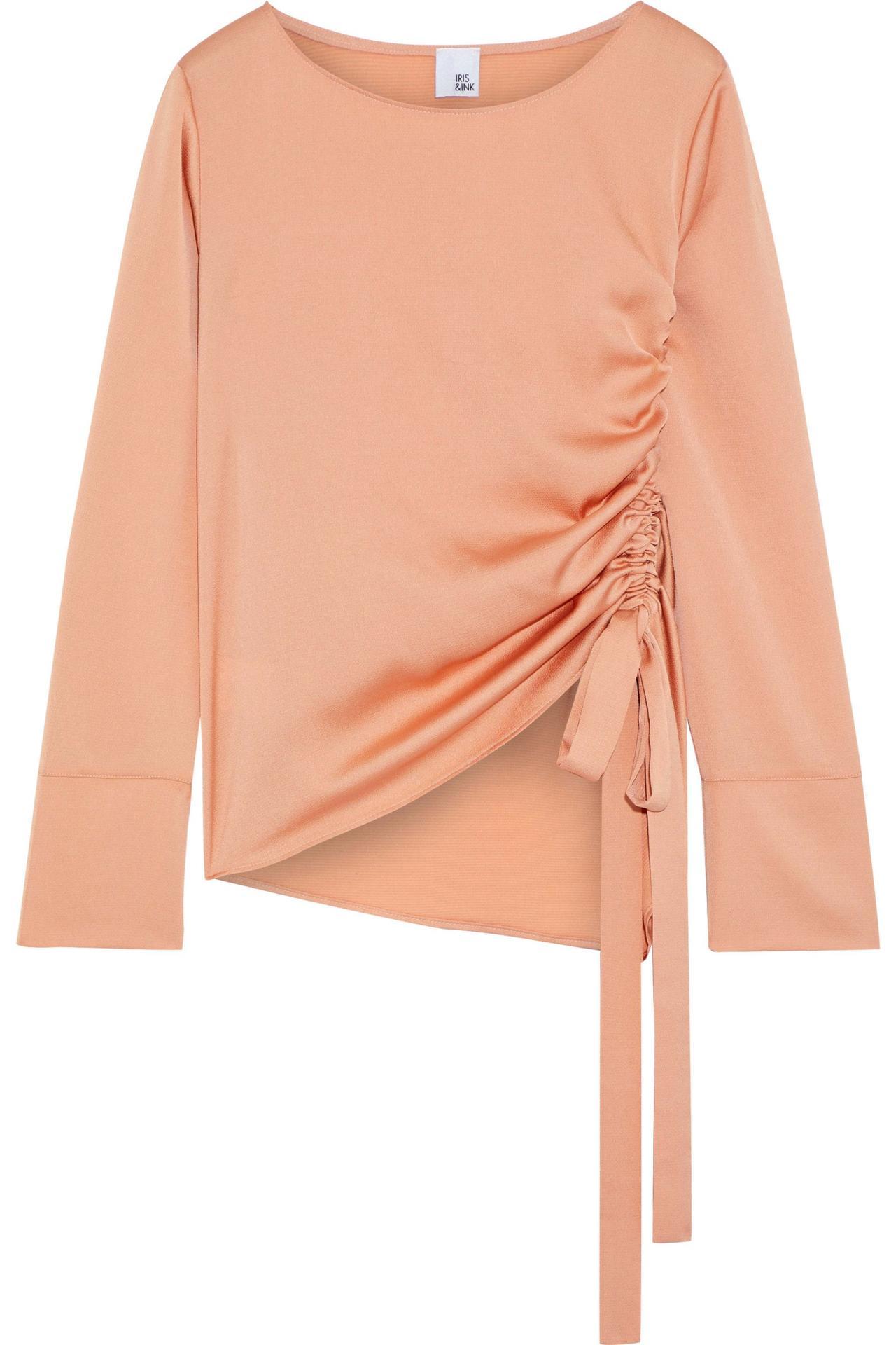 サテンの艶やかなピーチカラーがソフトな印象のIRIS & INKのルーシュ入り ハンマードサテン ブラウス。サイドにルーシュが入るデザインは立体感を演出してくれ、スカートでもパンツでも、スタイルをアップデートしてくれる一枚。
