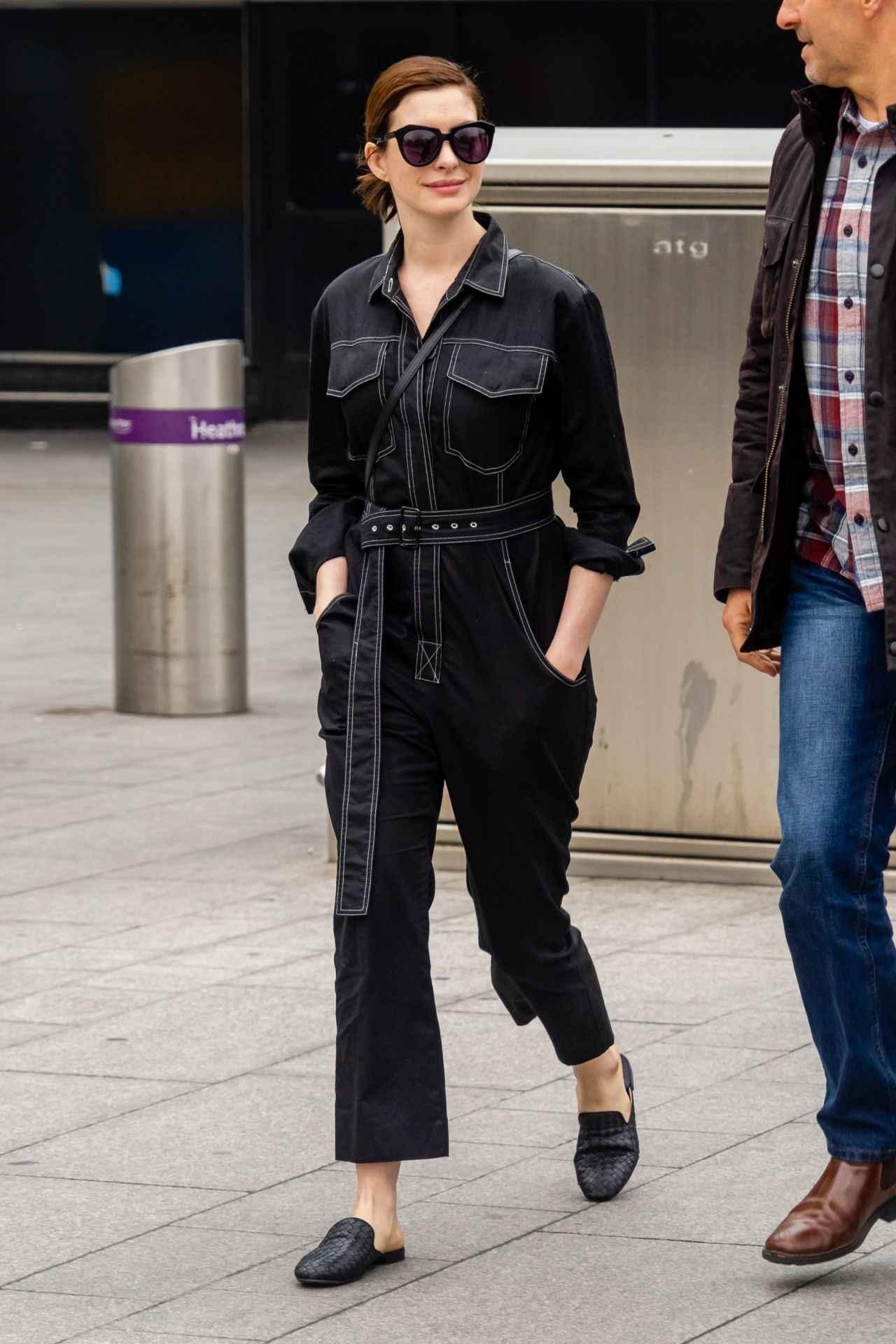 オスカー女優のアン・ハサウェイは、ブラックにホワイトステッチがアクセントになったボイラースーツにスリッパシューズを合わせたモダンなコーデ。