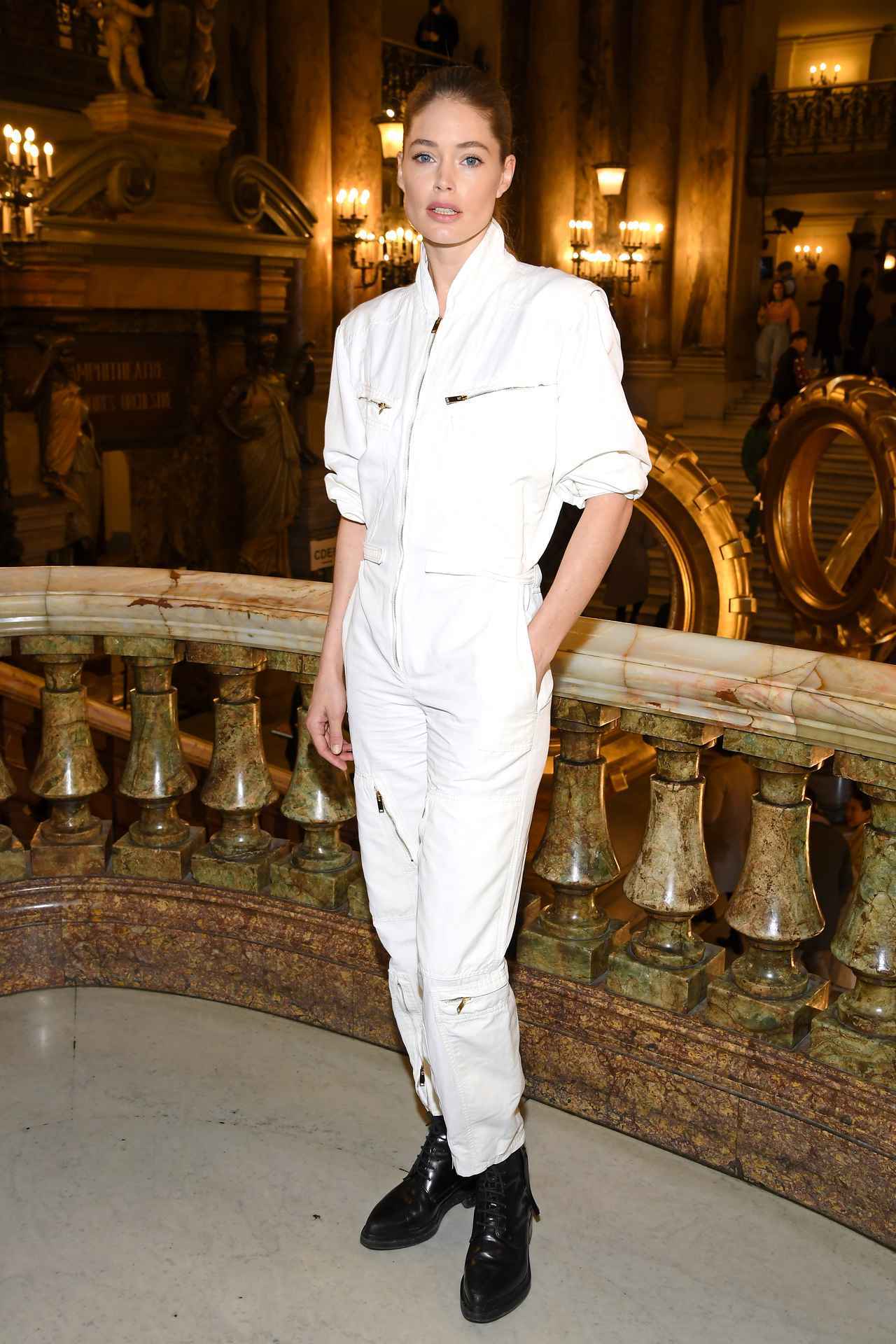 トップモデルのドウツェン・クロースは、ホワイトのボイラースーツの袖をたくし上げ、辛口なレースアップブーツでハンサムにコーデして。ジップがアクセントになったボイラースーツはステラ・マッカートニーの新作。