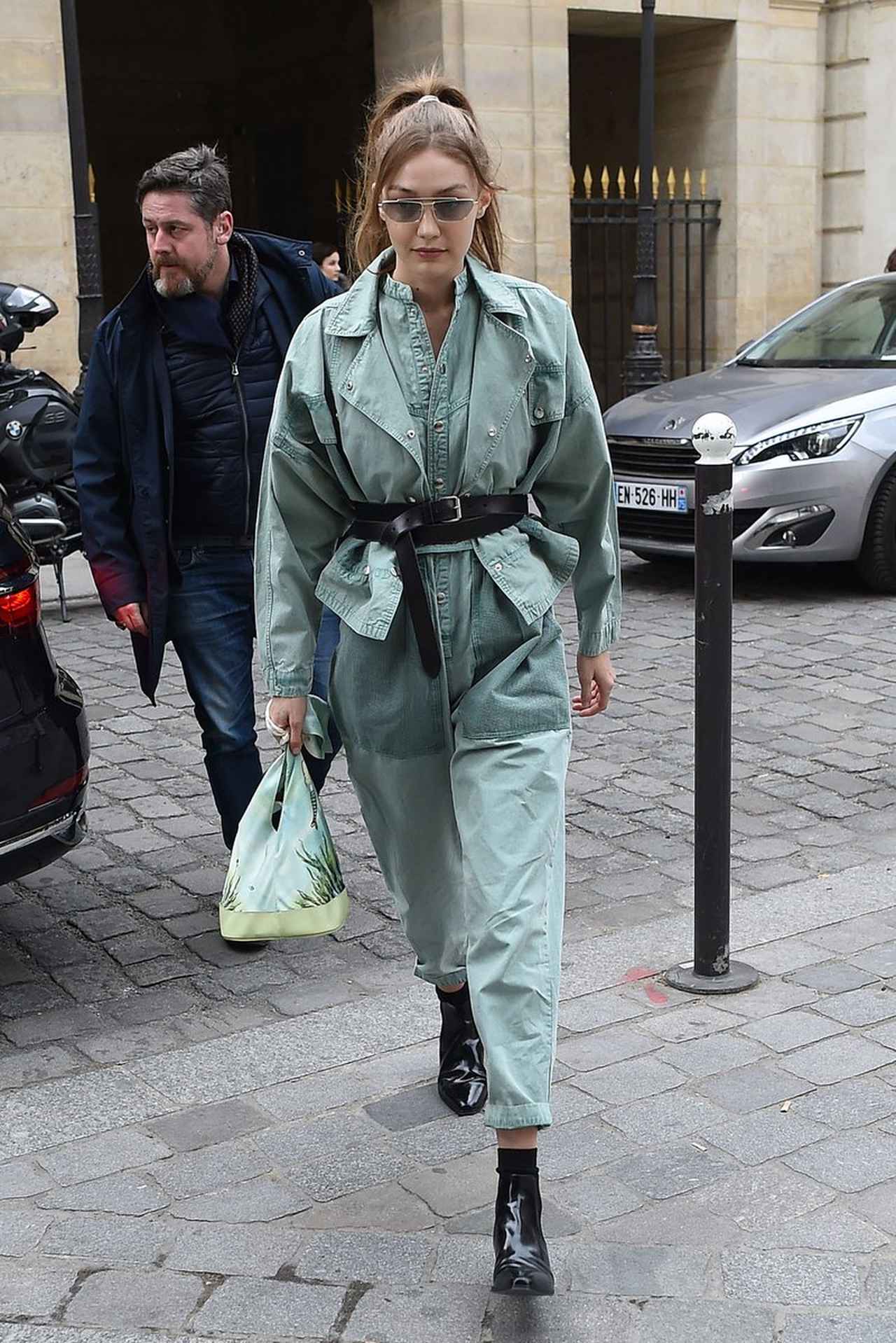 トップモデルジジ・ハディッドのお気に入りブランドのひとつIsabel Marantのデニムボイラースーツの上から、同デニムシリーズのジャケットをレイヤードして、二重ベルトでウエストマークした上級者コーデ。足元にはブラックのショートブーツで重さを出し、全体のバランスを取って。