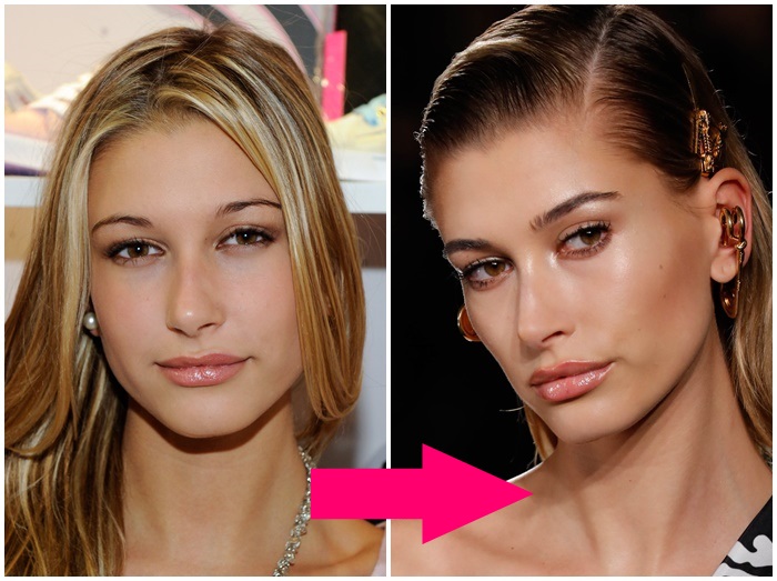 人気モデルのヘイリー・ビーバー、以前は細眉で眉頭どうしが離れているからすっきり。いまは自然な太眉で、眉が太い分、以前よりも顔がきゅっと引き締まって見えている。