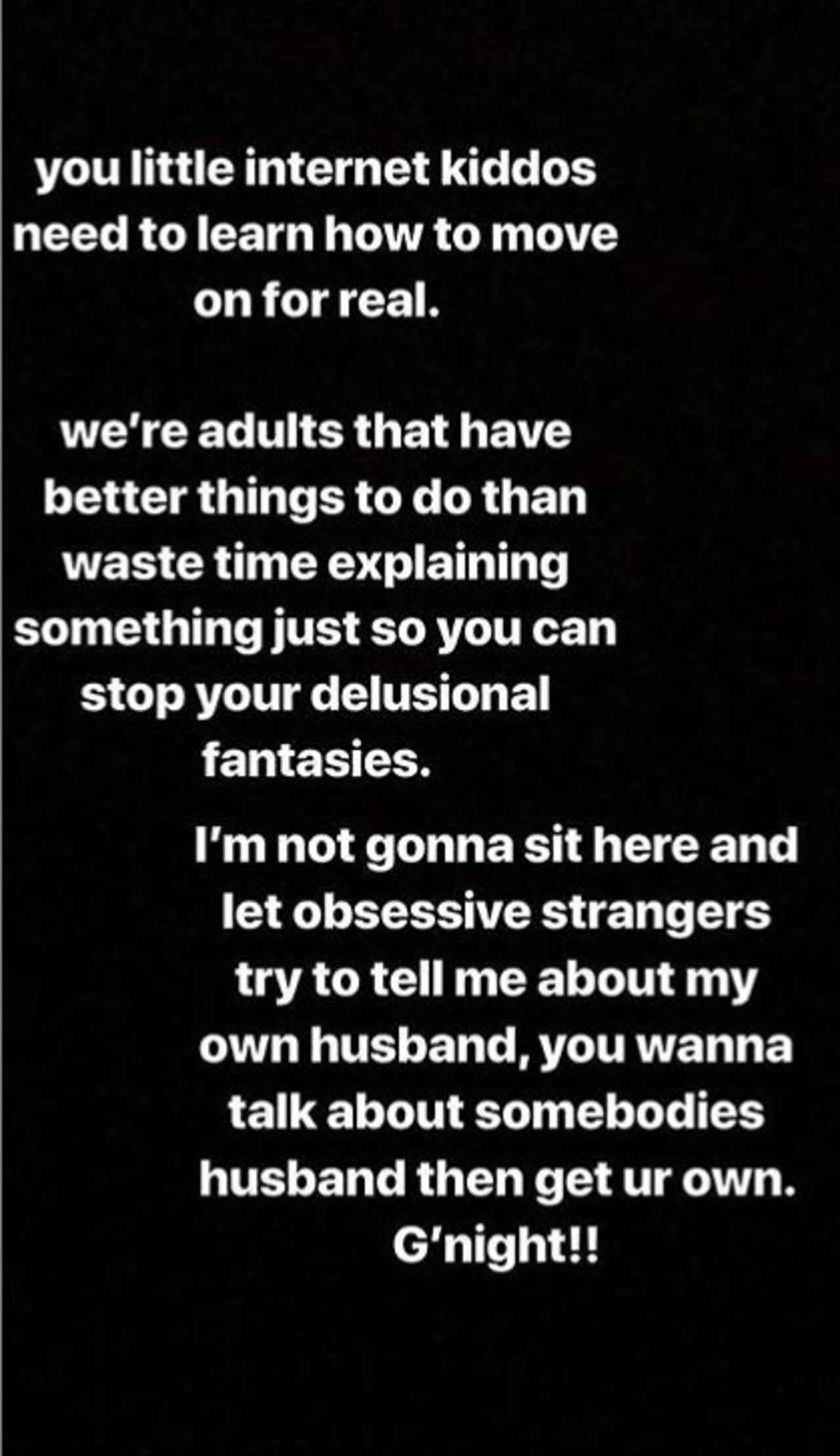 「ネット上のお子様たちは、前に進む方法を学んでちょうだい。私たちは大人で、あなたたちの間違った妄想を止めさせるためにいちいち物事を説明しているヒマはないの。ストーカーみたいな赤の他人に自分の夫のことをあれこれ言われて黙っているつもりはないわ。誰かの夫について話したいんだったら、自分の夫を見つけなさいよ。おやすみ! 」