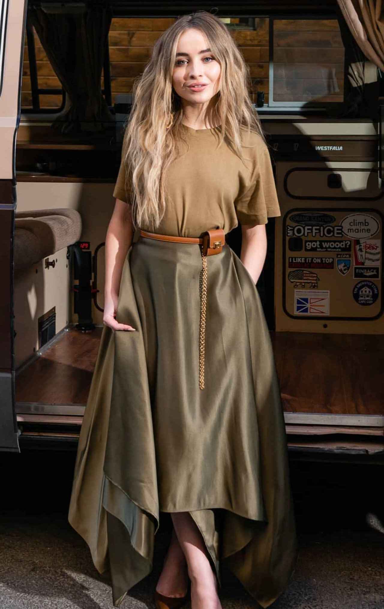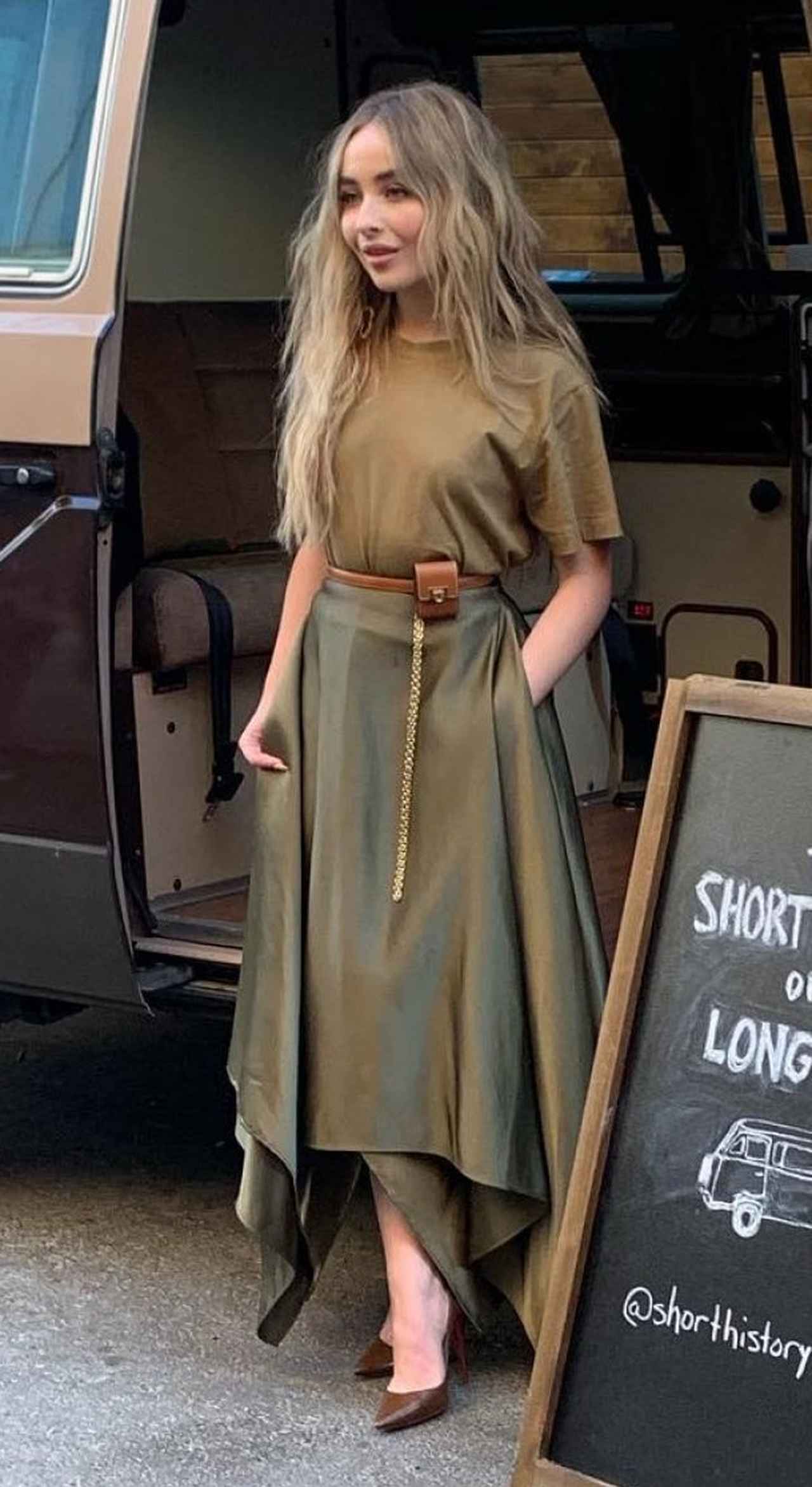 オリーブグリーンのTシャツにトレンドのサテンスカートを合わせ、ブラウンのベルトでウエストマークした、女優のサブリナ・カーペンター。ベルトにセットされたミニケースとゴールドのチェーンがアクセントに。