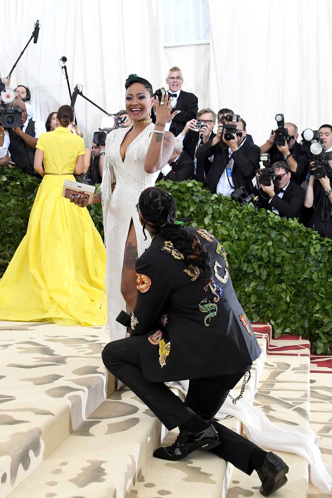 2018年のメットガラでラッパーの2チェインズ(2 Chainz)が、長年の恋人ケシャ・ワードにプロポーズ!もちろん「イエス」と答えたケシャは、指の横幅と同じくらい大きなダイヤモンドのリングを左手の薬指にはめ、満足そうにカメラの前でポーズを決めた。