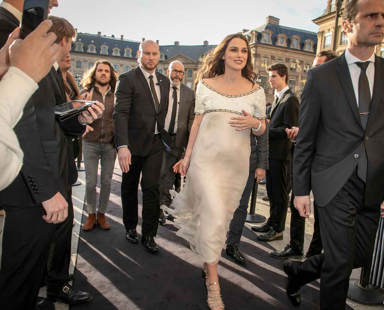 自身がミューズを務めるシャネル(CHANEL)の2020年クルーズコレクションのショーに先駆けてフランス・パリで行なわれたカクテルパーティーにクリーム色のベビードール・シルエットのドレスを着用して参加したキーラのお腹は妊娠がはっきりと分かるほどふっくら。