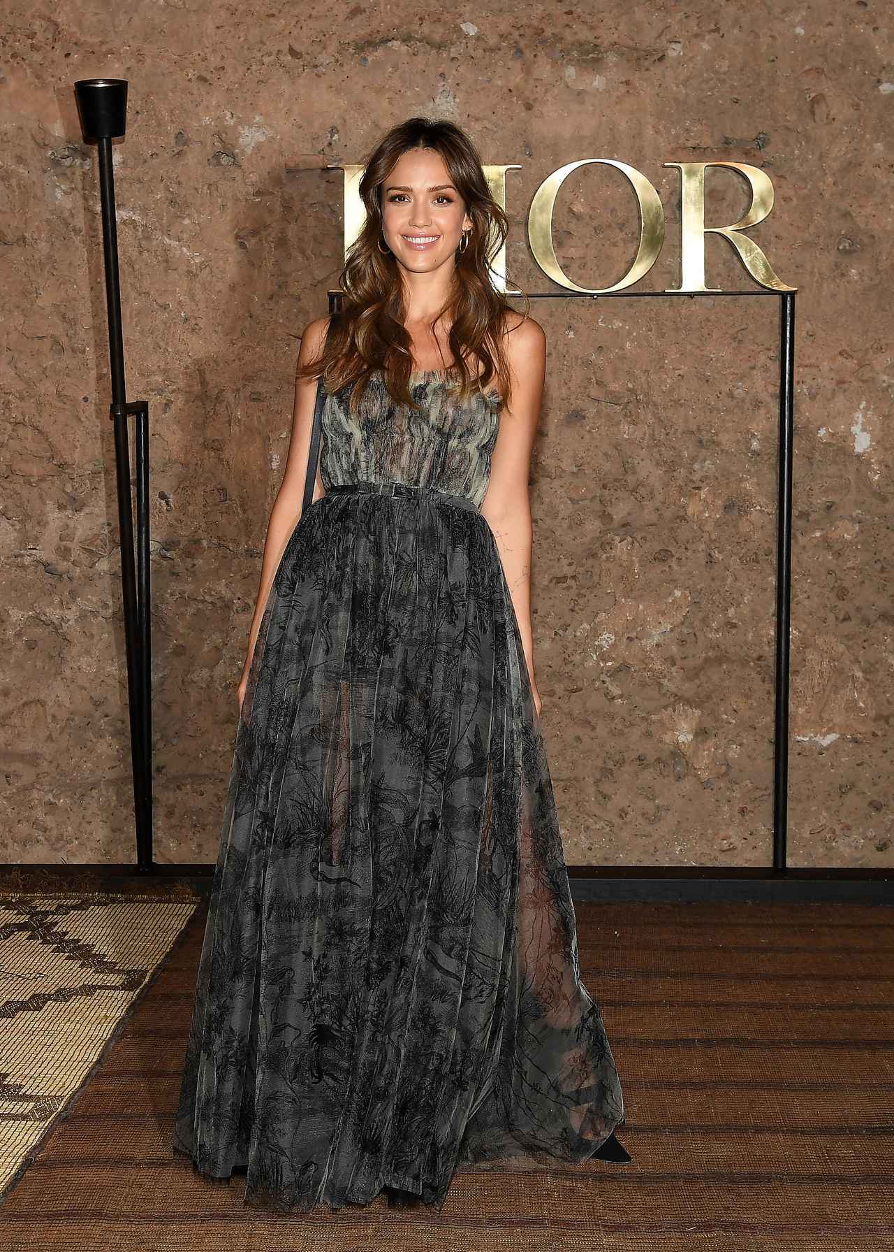 女優のジェシカ・アルバは、ディオールのシアーなレースに美しい絵画がプリントされた豪華なドレスを着用。