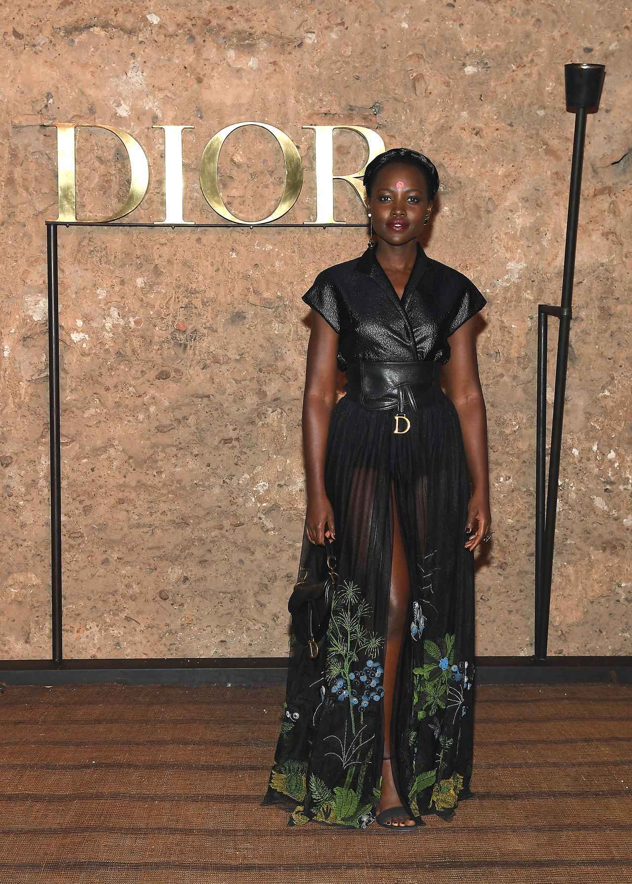 女優のルピタ・ニョンゴは、刺しゅうが美しいシアーなドレスにワイドベルトでアクセントをつけたシックなスタイル。