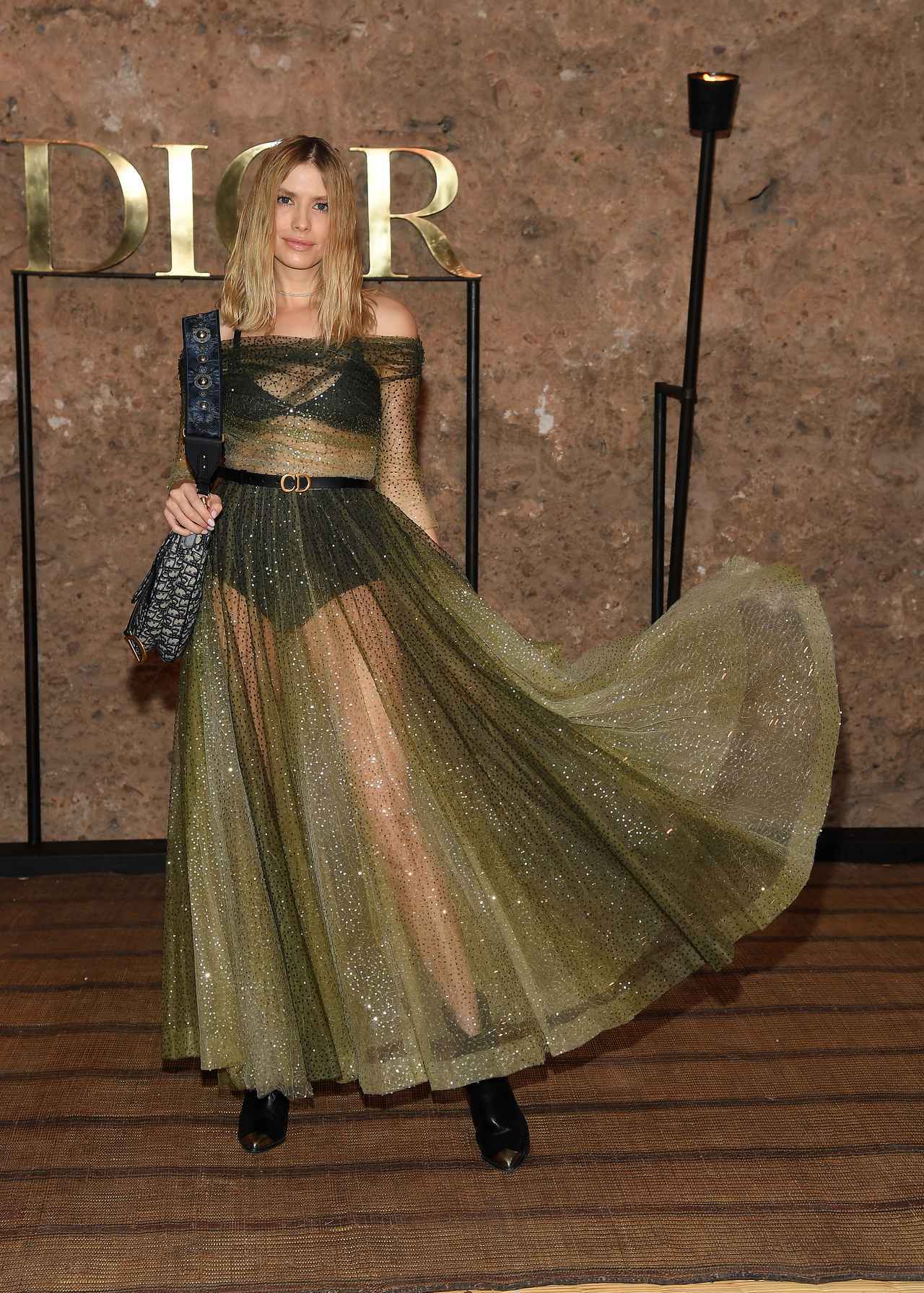 トップモデルのエレナ ペルミノヴァは、ディオールのラメが華やかなシアーなドレスを可憐に着こなして。
