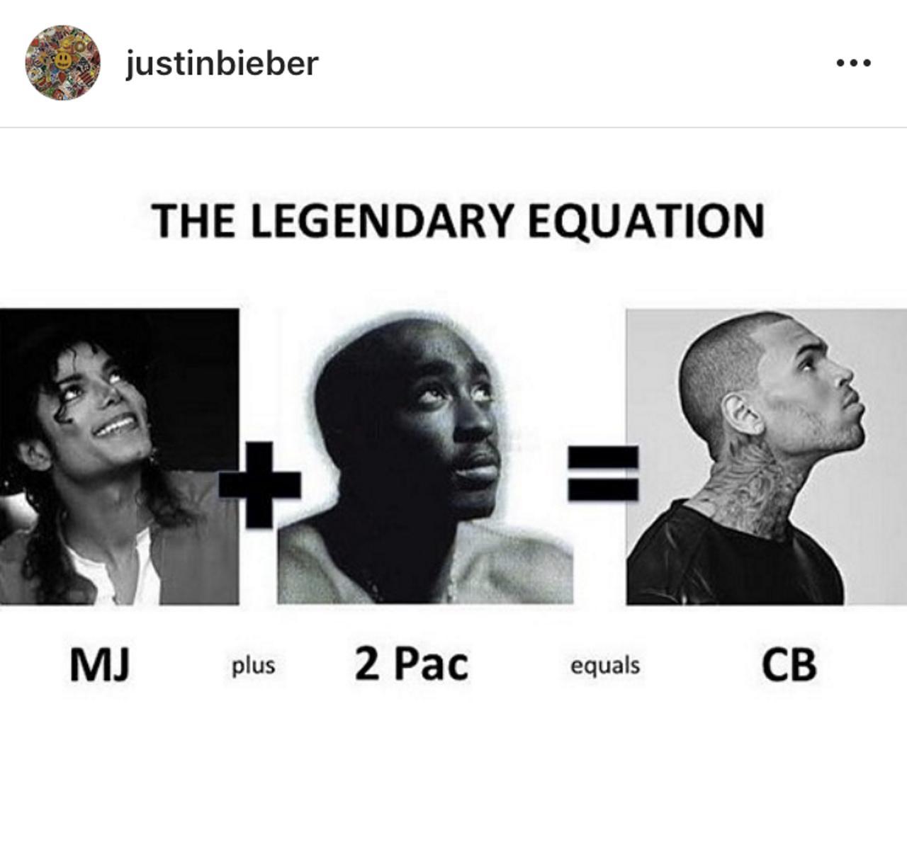 ジャスティン・ビーバーが先日、自身のインスタグラムに「レジェンドの方程式」と書かれた写真を投稿。そこには「マイケル・ジャクソン+2パック=クリス・ブラウン」と描かれており、言わずと知れたキング・オブ・ポップと、ヒップホップ界の伝説的ラッパーである2パックを足したような才能がクリス・ブラウンにはあると評し、クリスを絶賛した。