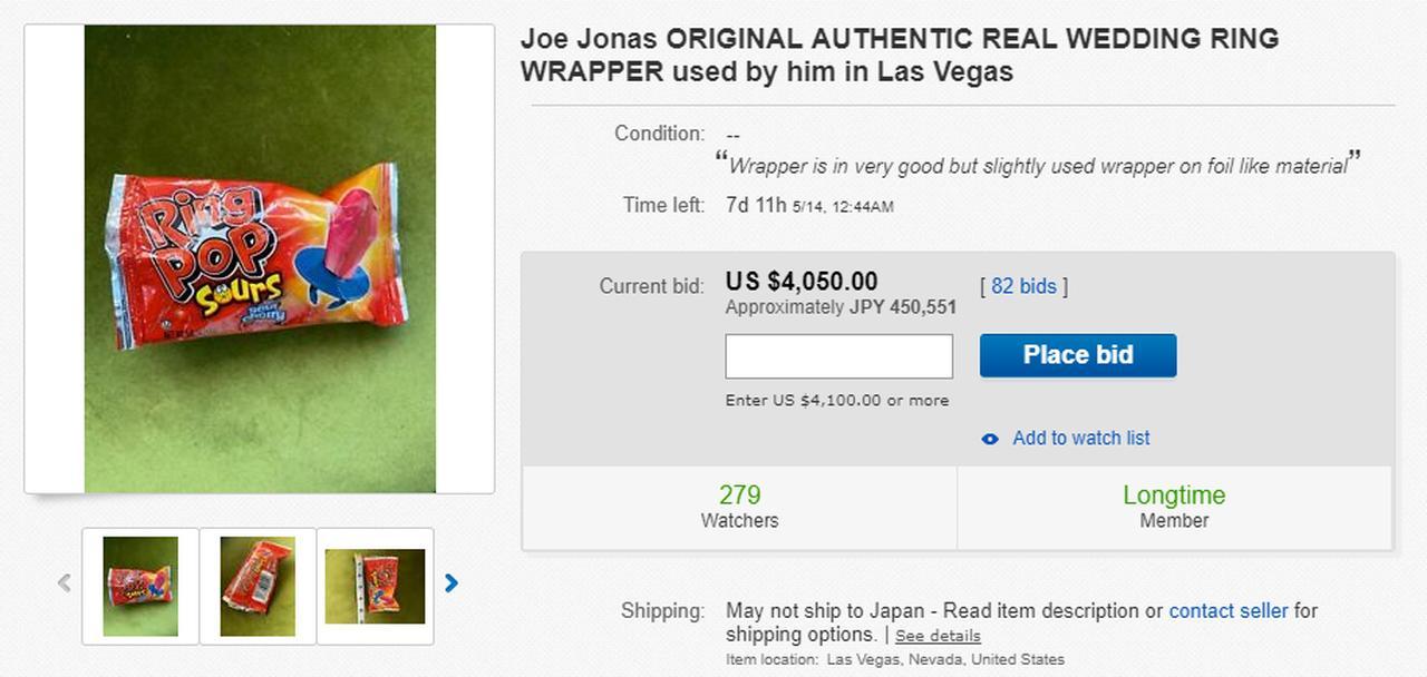 さらに驚くことに、結婚式で使われたキャンディリングの包み紙は、オークションサイトe-bayに出品されており、現在までに82人が入札し、価格は約45万円にもなっている。