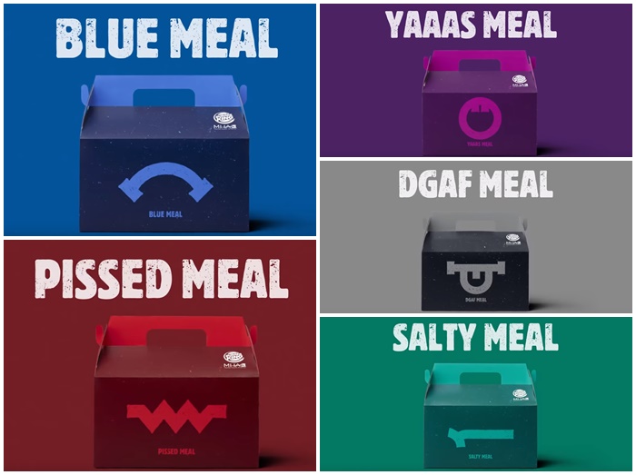 「リアル・ミールズ」では、様々な感情の名前がついたセットを5種類販売。怒りの赤、悲しみの青、イライラの青緑、もちろん!の紫、やってられっかの黒、というバリエーションになっていて、「ハッピー」という感情はない。