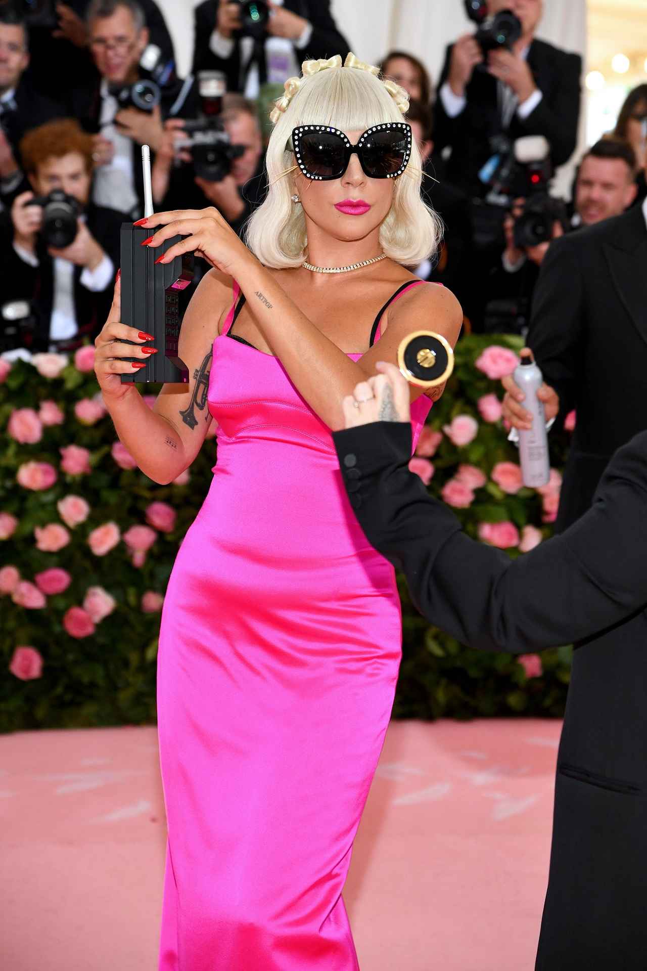 かつて自身のファッションチーム「ハウス・オブ・ガガ(Haus of Gaga)」でスタイリングを担当していたデザイナーのブランドン・マックスウェル(Brandon Maxwell)の鮮やかなピンクのボリューミーなドレスを着用し、雨も降っていないのに傘を差したお付きの人たちを引き連れて現れたガガ。