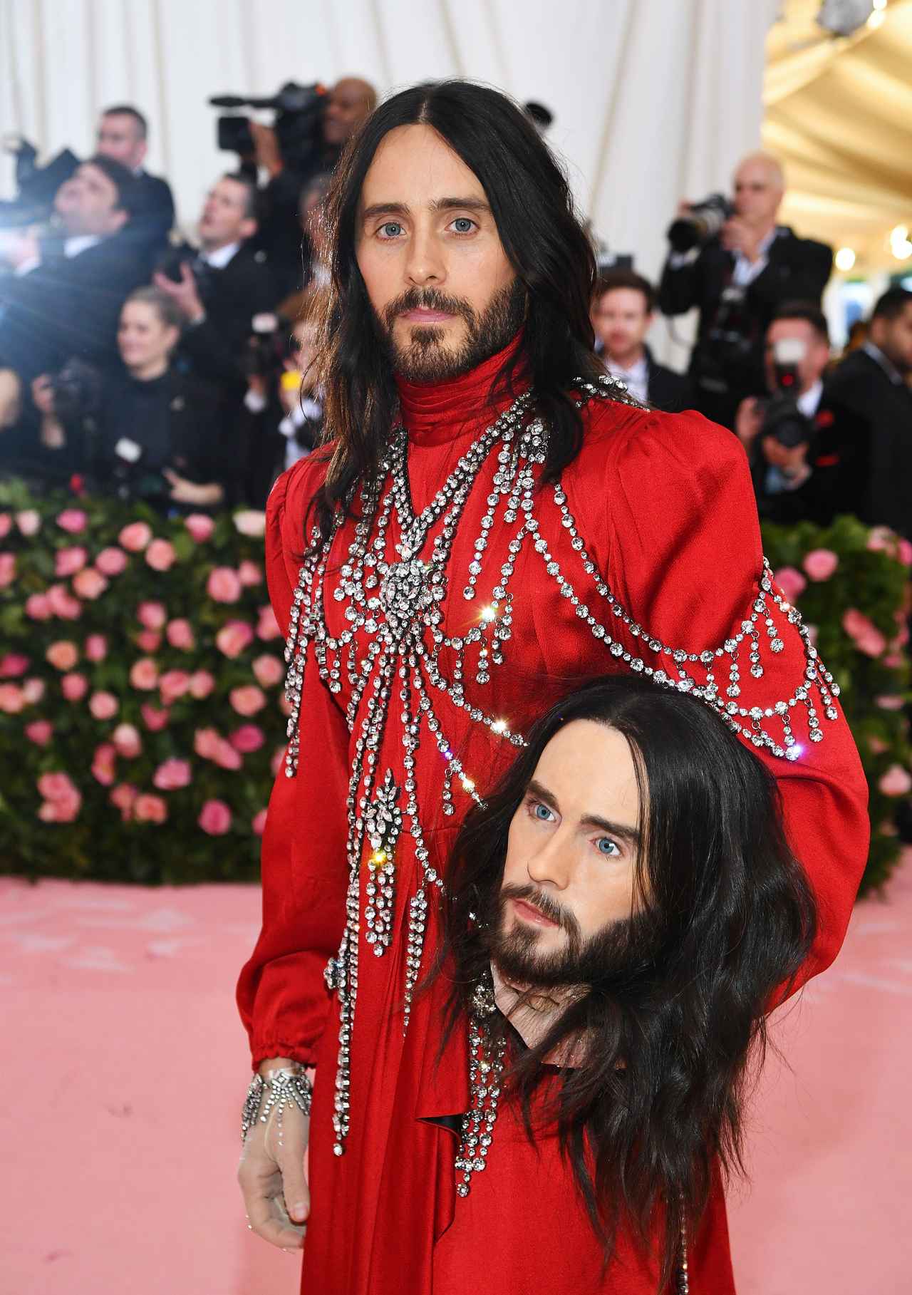メットガラ2019には広告塔を務めるグッチを着て現れたジャレッド。アレッサンドロ・ミケーレがクリエエイティブディレクターを務めるグッチは2018年秋冬コレクションでモデルそっくりの生首をモデルに持たせてランウェイを歩かせるパフォーマンスをしており、今回のジャレッドの生首アイディアはそこが発祥と見られる。(フロントロウ編集部)