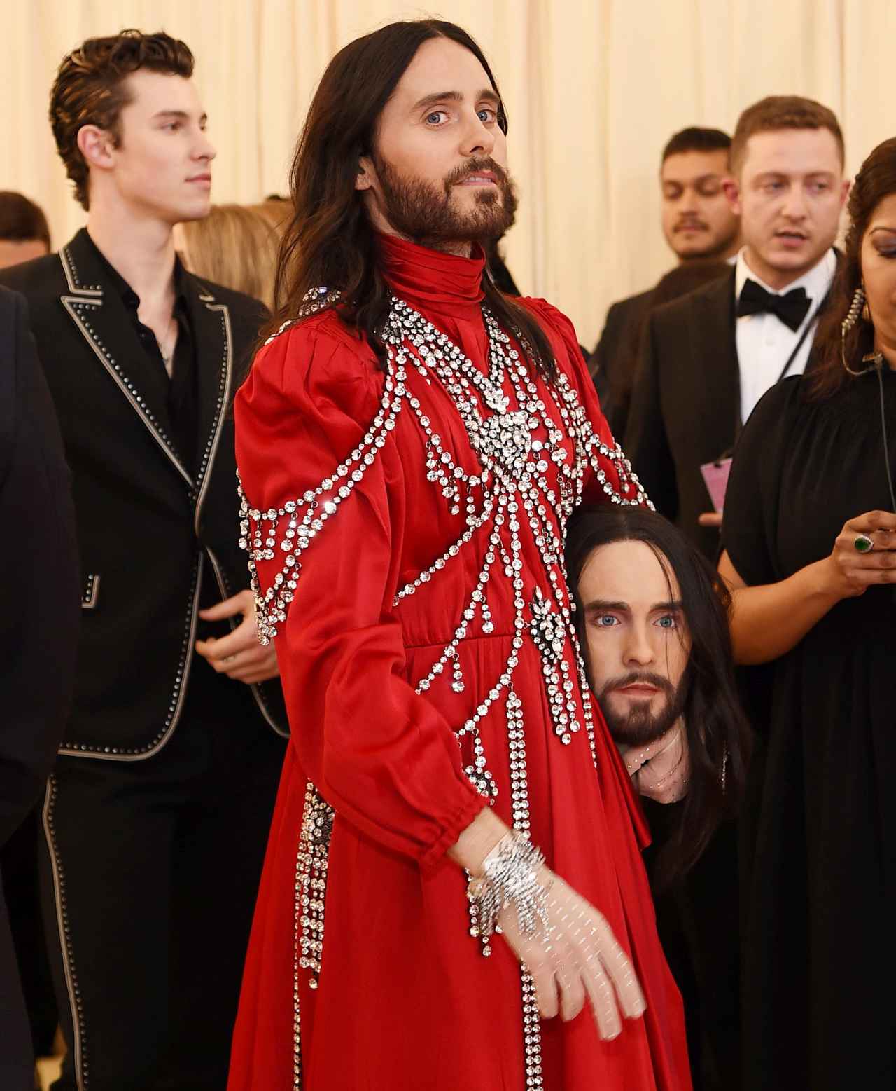しかもただの生首ではなく、ジャレッドそっくりの生首。レッドカーペットではジャレッドがこの生首を小脇に抱えたり、宙に上げて見つめ合ったりして、リアル・ジャレッドと生首ジャレッドの奇妙な共演が実現。さらにジャレッドが近くを歩いていたシンガーのショーン・メンデスに生首をぽいっと渡し、ショーンをびっくりさせるというひと幕も。