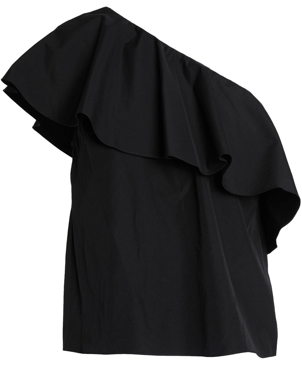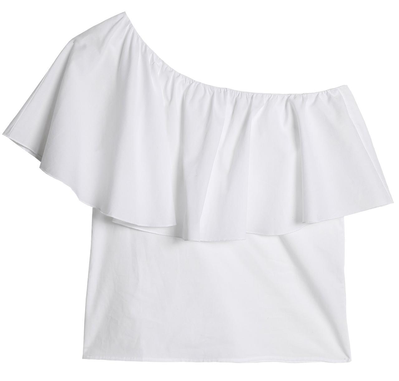 ラッフルのデザインがキュートな印象のワンショルダートップス。フェミニンなトップスを、セレブたちのようにデニムに合わせてラフにコーデすれば、今年顔スタイリングに。