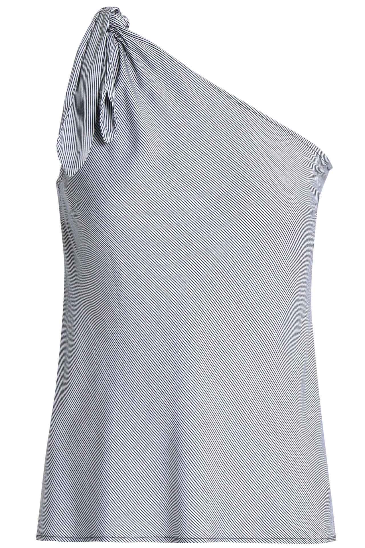 デニムと好相性な、極細ストライププリントのワンショルダートップス。ショルダー部分がキュッと結ばれたノットデザインも、コーデのアクセントになりオシャレ見えする一枚。