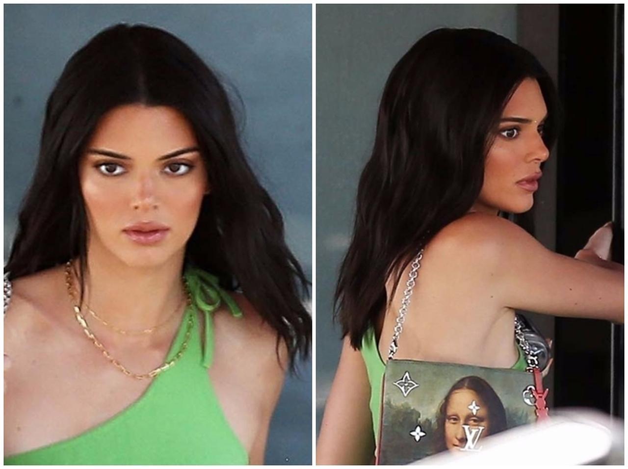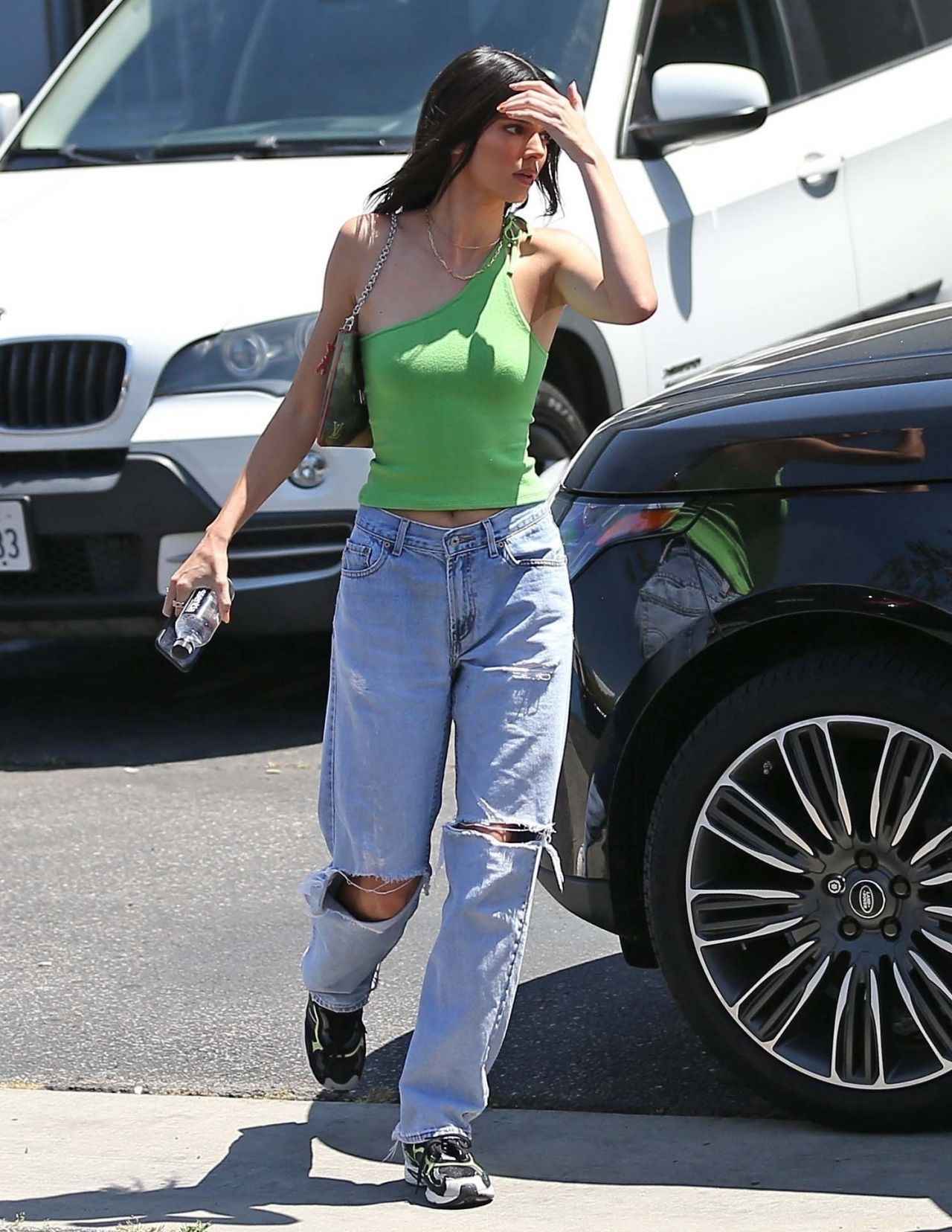 トップモデルのケンダル・ジェンナーは、グリーンのワンショルダートップスに、ダメージデニムとスニーカーを合わせたクールなコーデ。