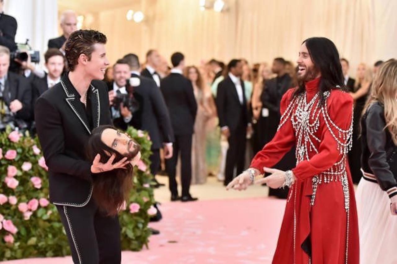 グッチ(Gucci)の真っ赤な衣装に身を包み登場したジャレッド・レトが、手に持っていたのは、自分にそっくりな生首。よく見れば作り物と分かるとはいえ、髪の毛やひげまでしっかり再現された顔は、なかなか不気味。