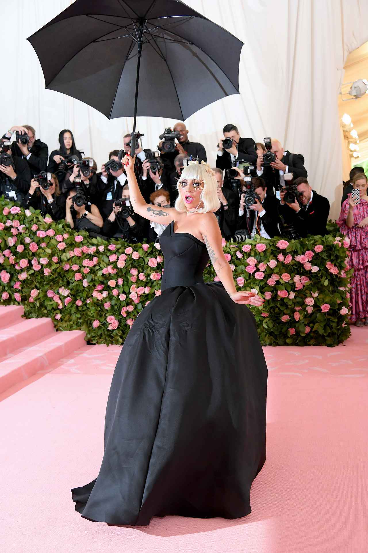 会場に、真っピンクなガウン姿で登場したシンガーのレディー・ガガ。それだけでも十分可愛いのだけれど、ガウンの下には真っ黒でシックなドレスが。