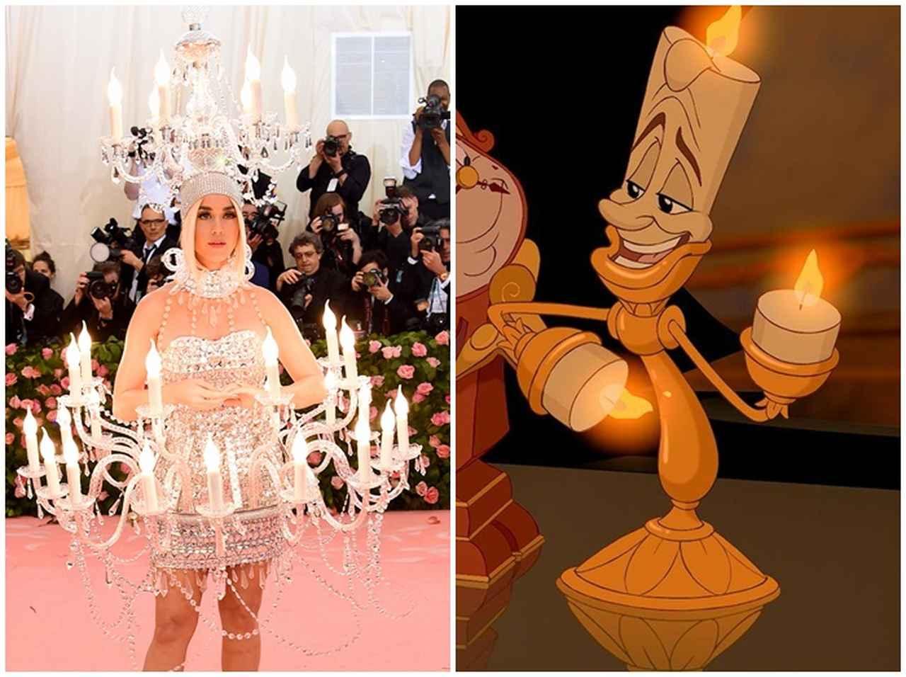 シンガーのケイティ・ペリーは、その明るいキャラクターを衣装にしたかのような、ライト満載の衣装で登場。するとファンの目には、あの有名アニメキャラクターの姿が重なってしまった。それはディズニーのアニメ映画『美女と野獣』のルミエール。