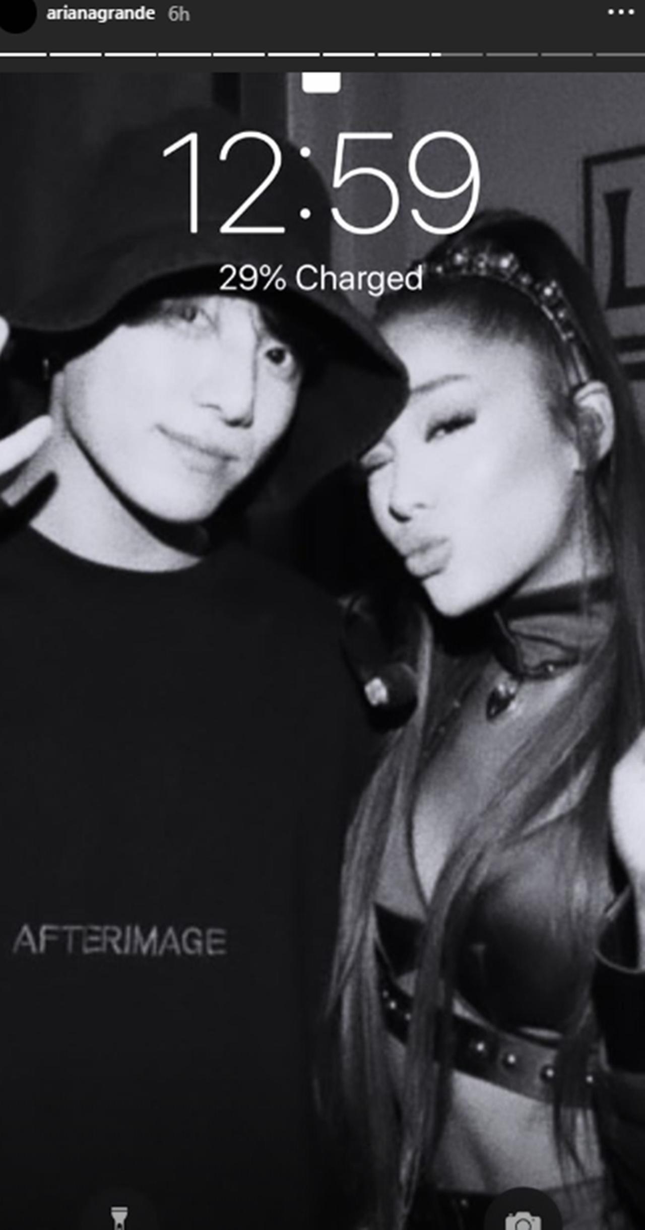 アリアナはジョングクとの2ショット写真を自身のインスタグラムに公開し、「私のショーに来てくれて本当にありがとう、ジョングク。とても意味のあるものだったわ。すごく愛してる」と、舞台裏で対面を果たした喜びを綴った。