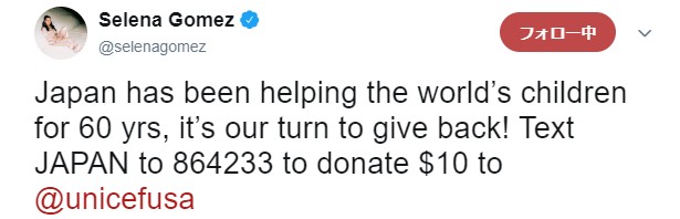 2011年3月に東日本大震災が起きたときには、「言葉がありません。ついこの間訪問したばかりなのに。すべての愛と祈りと支援の気持ちを送ります」とSNSに投稿。その後フォロワーに向けて、「日本は世界の子供たちのために60年間(※)も活動を続けてくれています。今度は私たちが恩返しする番です」と、被災者支援をするユニセフへの寄付を呼び掛けた。