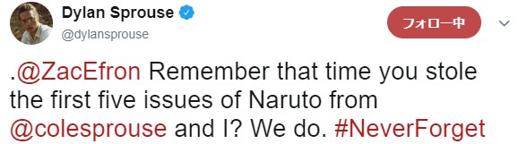 『ハイスクール・ミュージカル』のザック・エフロンも日本の漫画が大好きで、『デスノート』『BLEACH』『ドラゴンボール』など、ヒット作を網羅。同じく漫画好きのディラン・スプラウスから、「僕とコールから『NARUTO -ナルト-』の1~5巻を盗んだのを覚えてるかい?僕らは覚えているよ。一生忘れない」とツイッターでバラされたことが。