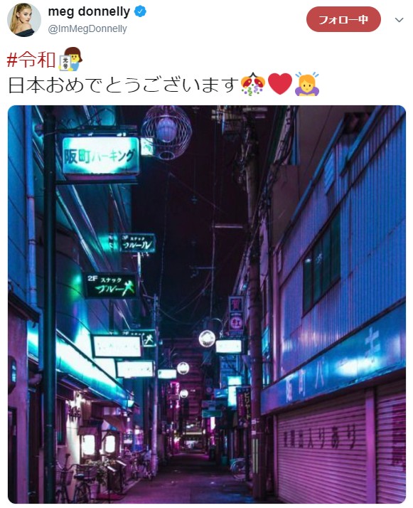 令和という新元号が発表された当日にツイート。©Meg Donnelly/Twitter