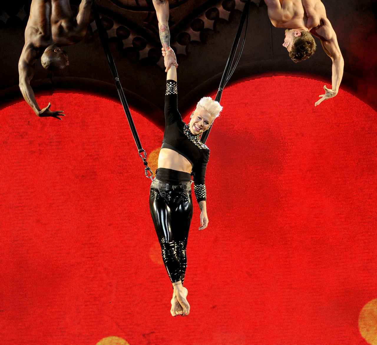 トラピーズという空中ブランコを使ったアクロバティックな宙づりパフォーマンスはピンクのお家芸。