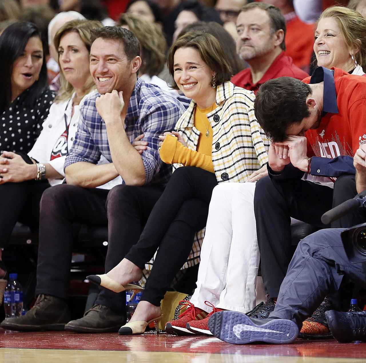 5月10日に行なわれたアメリカのバスケットボールチーム、ヒューストン・ロケッツ対ゴールデンステイト・ウォリアーズの試合を観戦していたエミリア・クラーク。