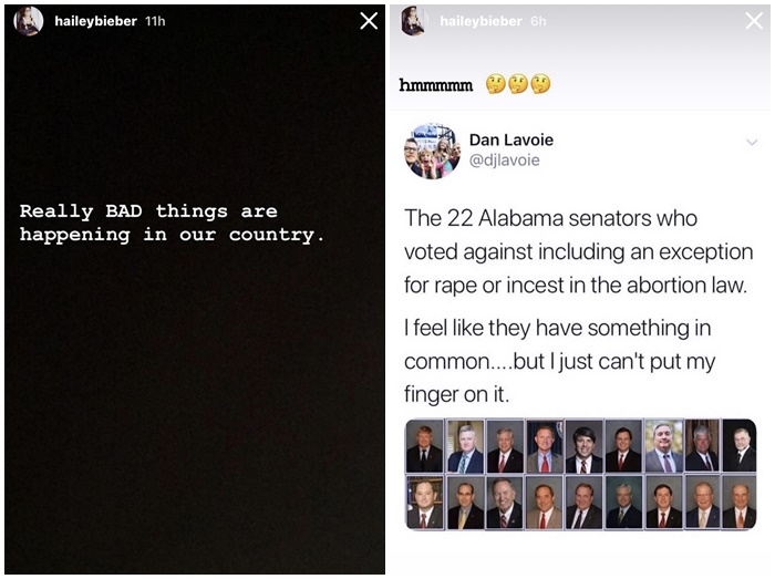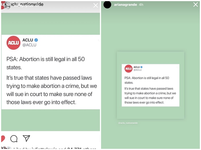 人権活動に熱心なマイリー・サイラスやアリアナ・グランデは、自身のインスタグラムのストーリーに、ACLUが中絶禁止法を制定した州を訴えることを表明した投稿をシェア。ヘイリー・ビーバーもインスタグラムのストーリーに「私たちの国にすごく悪いことが起きている」とコメントし、例外を認めることに反対した22人の上院議員の顔が写るツイートを公開するなど、多くのセレブが中絶禁止法に反対する声を上げている。