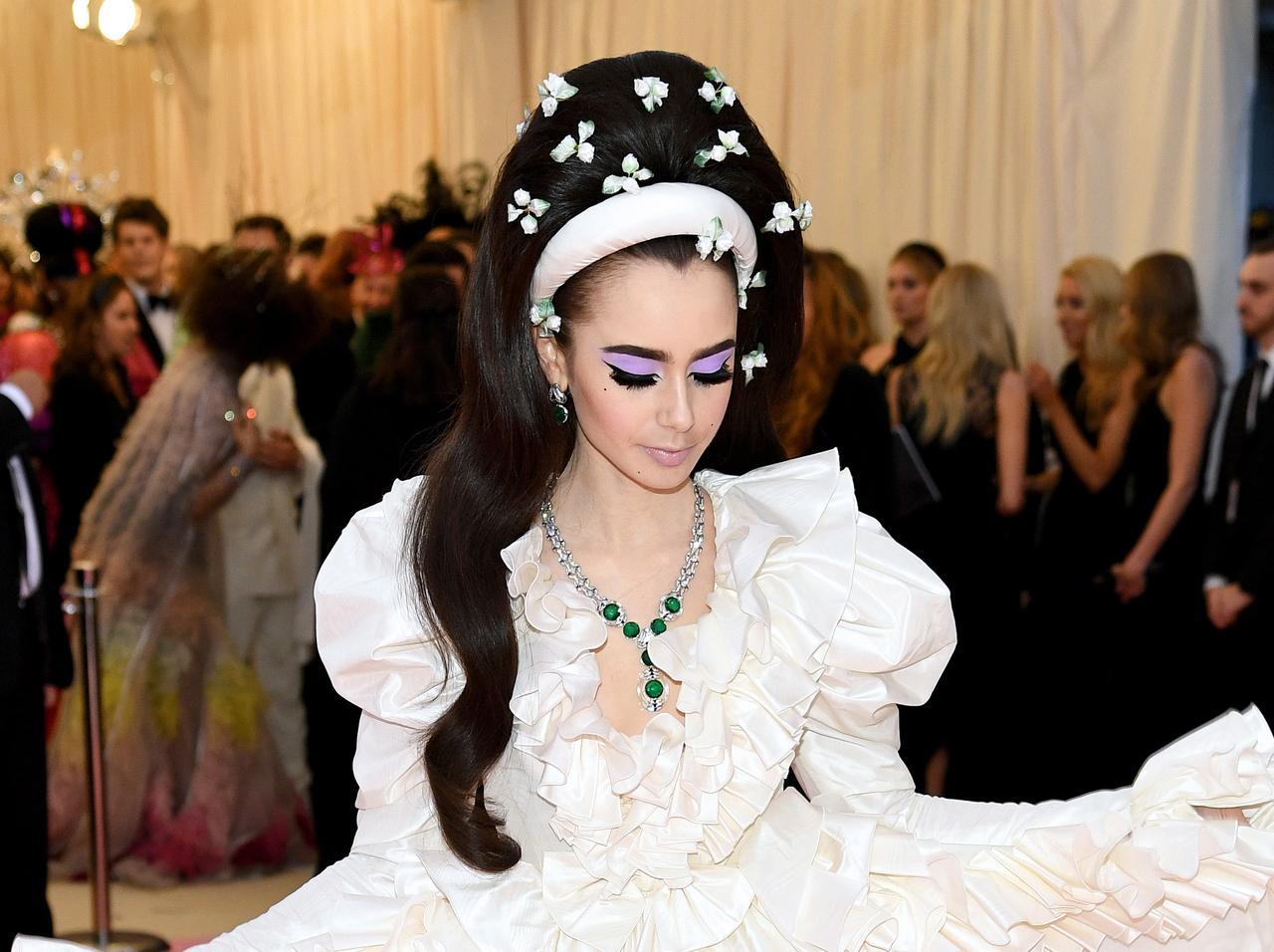 『トールキン』や『白雪姫と鏡の女王』などで知られる女優のリリー・コリンズ。先日5月6日に開催されたファッションの祭典メットガラ(Met Gala)では、フリルの白いドレスを着用した個性的なプリンセス姿で登場した。