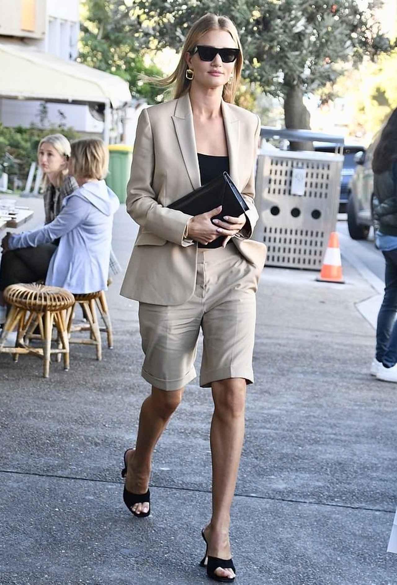 今季注目トレンドのベージュのセットアップショーツをクールに着こなした、人気モデルのロージー・ハンティントン・ホワイトリー。黒のインナーに合わせて、黒のピラミッドヒールを合わせた最旬コーデ。