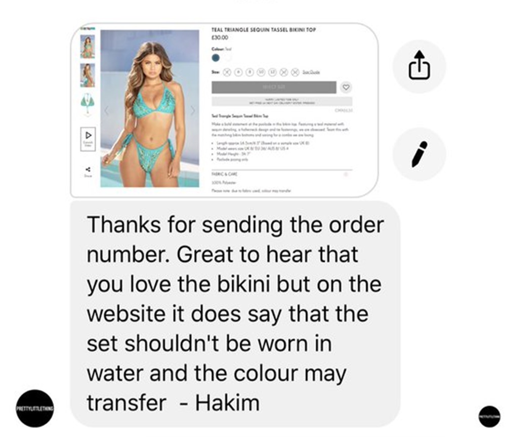 「ご連絡ありがとうございます。我々のビキニを気に入ってくれたと聞いて大変喜ばしく思っております。しかし、このビキニは水の中で着る用ではないことや、色移りする可能性があることはサイトにちゃんと書かれています」