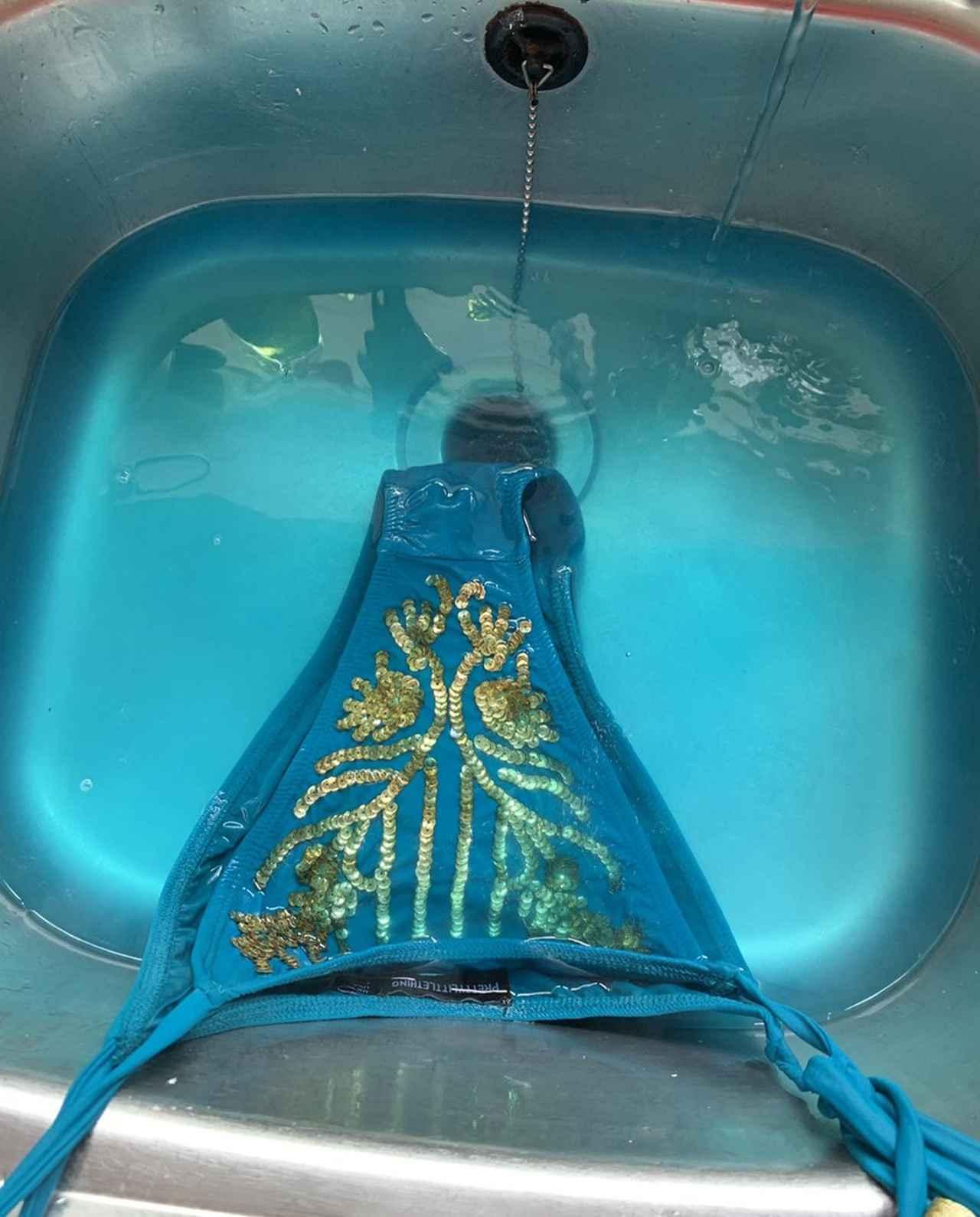 この「水に入れない水着」の存在が世間に知られるきっかけとなったのは、プリティ・リトル・シングで水着を購入したイギリス在住の女性、アリーシャ・ディンがツイッターにアップしたある写真。そこに写っていたのは、鮮やかな水色にビキニボトムと真っ青に染まった水。
