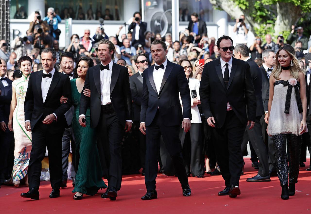 共演者のマーゴット・ロビー(写真右)やクエンティン・タランティーノ監督(写真右から2番目)らとカンヌ国際映画祭のレッドカーペットに登場したブラッドとレオナルド。