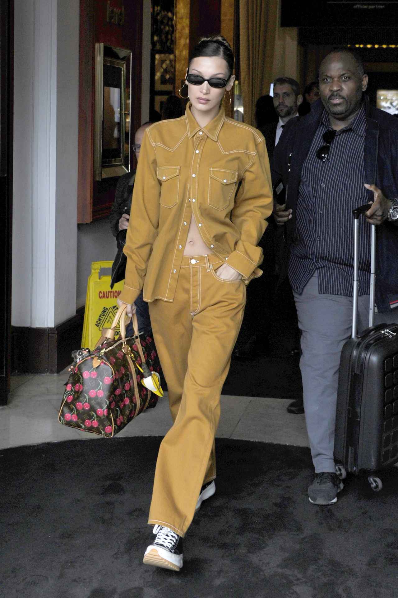 おなじみのブラックのキャンバスボディのアッパーに、ボリューミーなチャンキーソールをミックスさせた大胆なデザインの「BLACK RUN STAR HIKE CONVERSE」。ベラはLouis Vuittonのチェリープリントがポップなボストンバッグを合わせてプレイフルにコーデして。