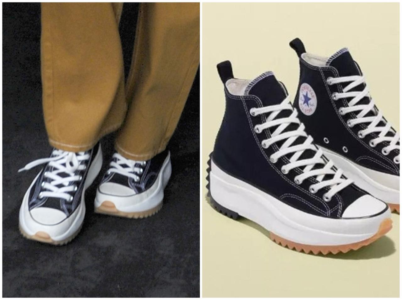 セレブ御用達ブランドSandroのセットアップパンツの足元を印象づけるのは、コンバースの名作チャックテイラーをロンドン発のブランド、JW アンダーソンが大胆にデザインしたコラボスニーカー「BLACK RUN STAR HIKE CONVERSE」。