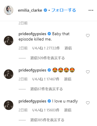 この可愛すぎるジェイソンの一連の反応には、多くのファンが胸キュン。プライベートでも仲が良いことで知られているエミリアとジェイソンのラブラブっぷりが現れた一連のコメントには、6万以上ものいいねが集まっている。