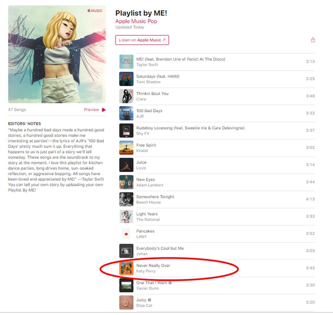 今年4月に発売した待望のニューシングル「ME!」が大ヒットしているシンガーのテイラー・スウィフトが、米現地時間5月31日に解禁されたばかりケイティ・ペリーの新曲「ネヴァー・リアリー・オーヴァー(Never Really Over)」を、早速Apple Music(アップルミュージック)で公開している自身のプレイリストに追加。