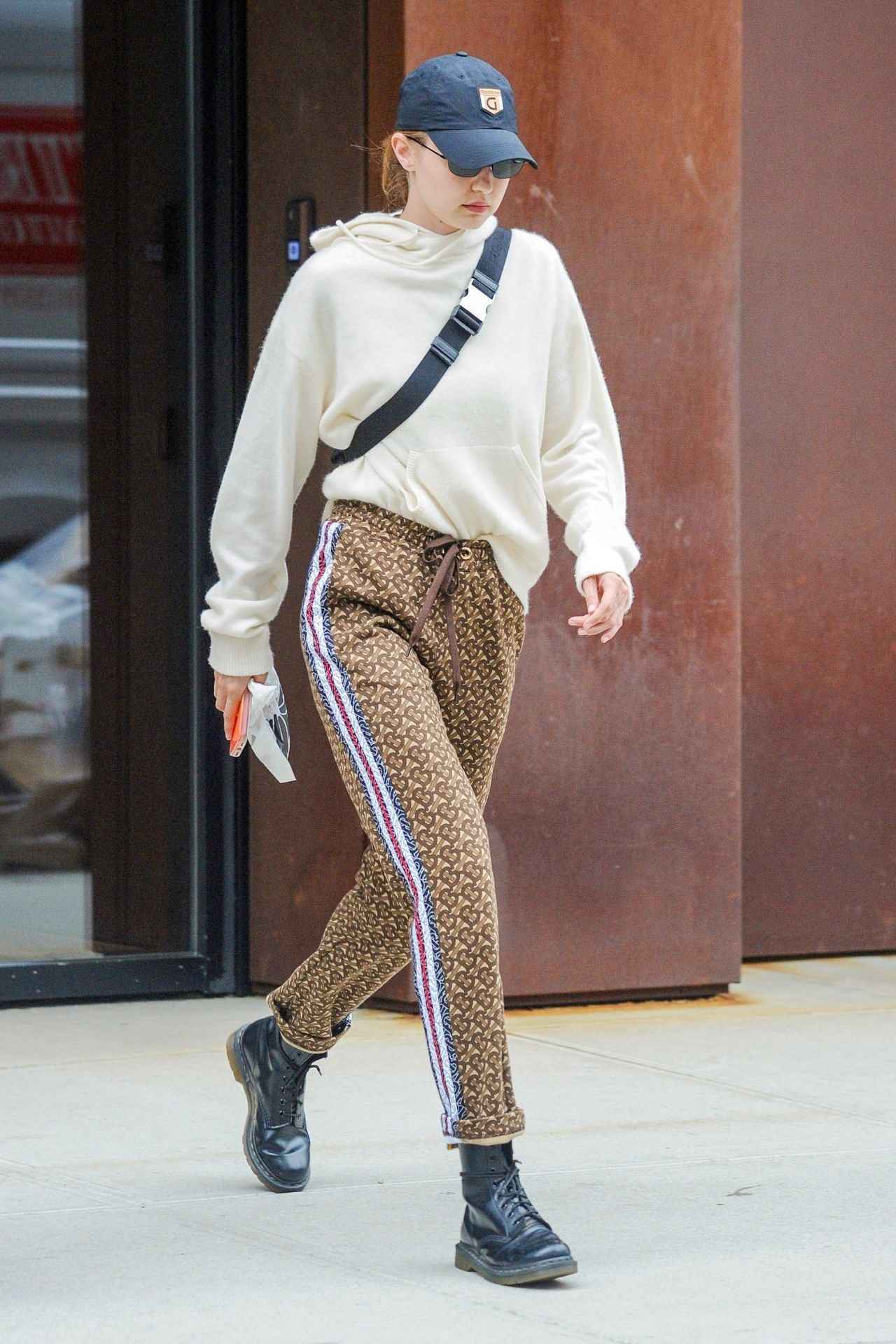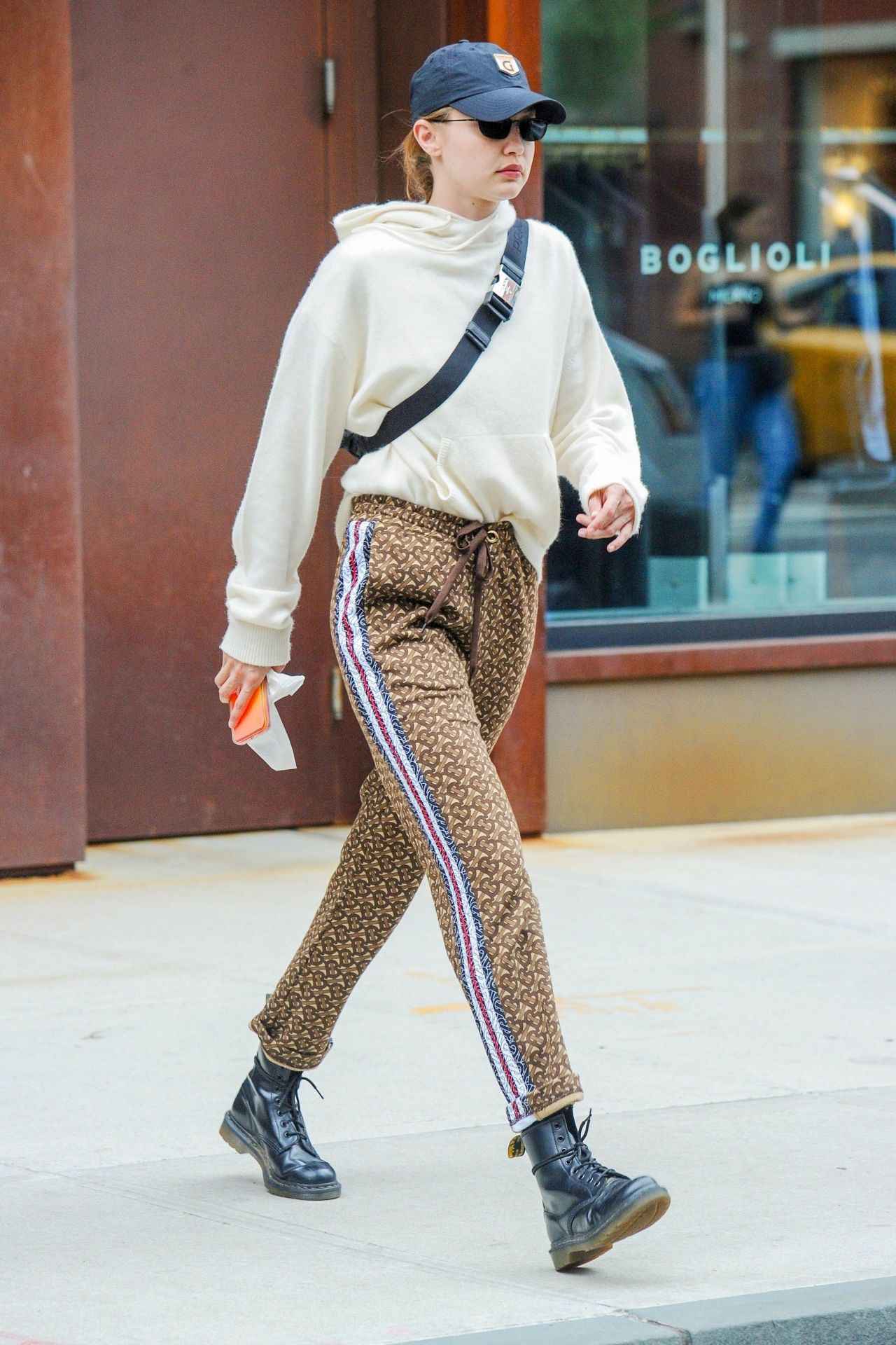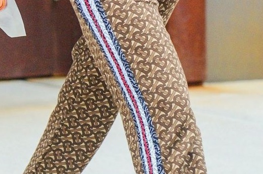 トップモデルのジジ・ハディッドは、バーバリーの新モノグラムが全面に配されたトラックパンツをプライベートで着用。