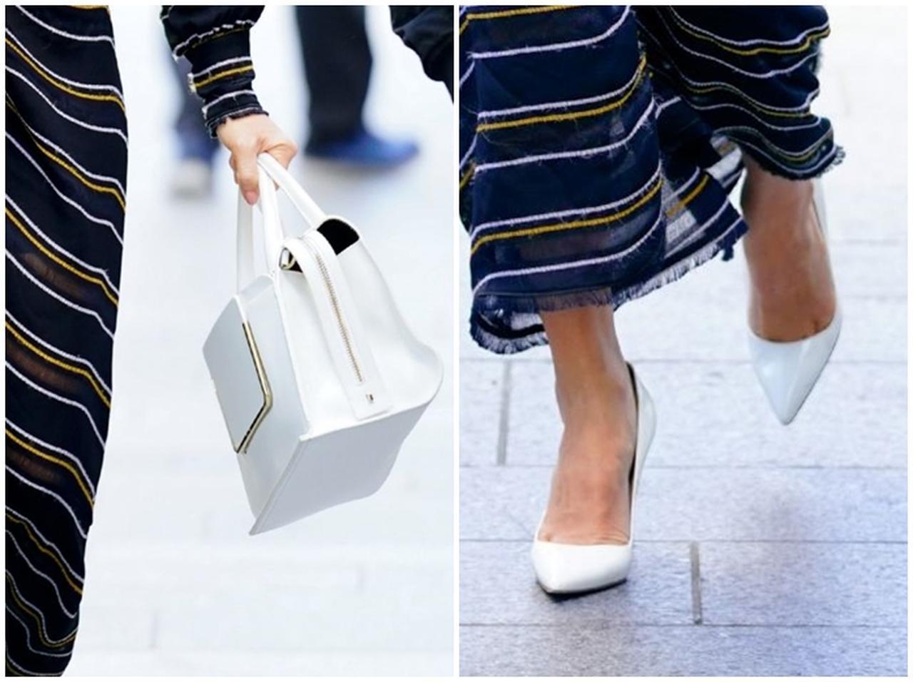 ネイビーのストライプには、ホワイトカラーが好相性! ジェシカはハンドバッグとパンプスをホワイトで統一して、全体を爽やかにコーデして。