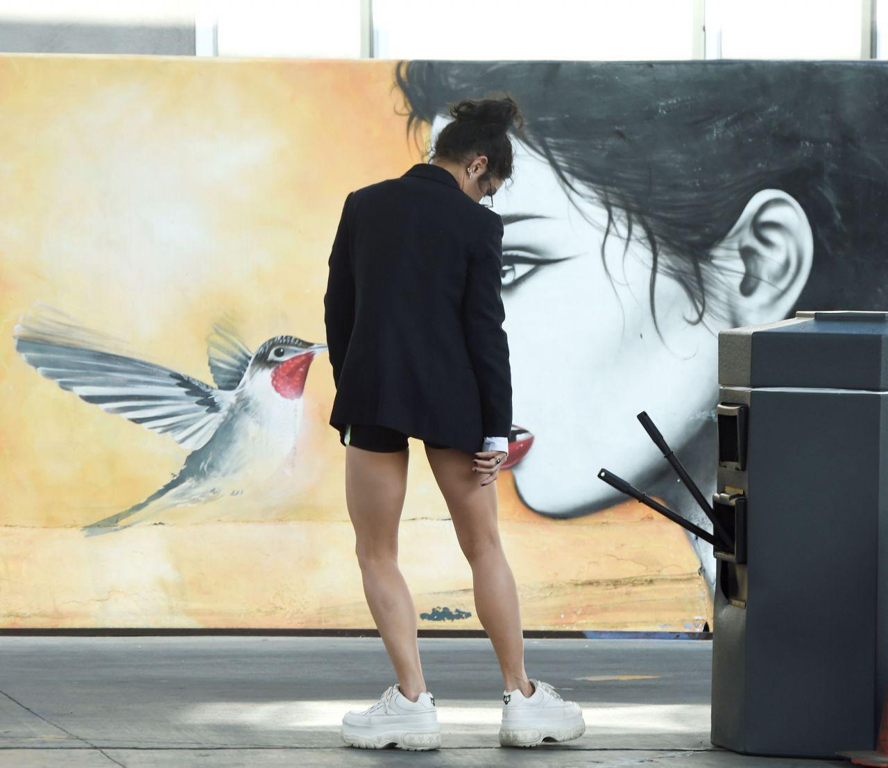 トレンドのショートパンツセットアップを着用し、足元にはネイキッドウルフの厚底スニーカーで90年代コーデを作った人気女優のヴァネッサ・ハジェンズ。