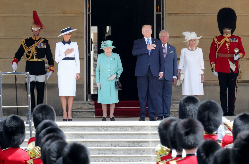 バッキンガム宮殿でエリザベス女王らと面会するトランプ大統領。