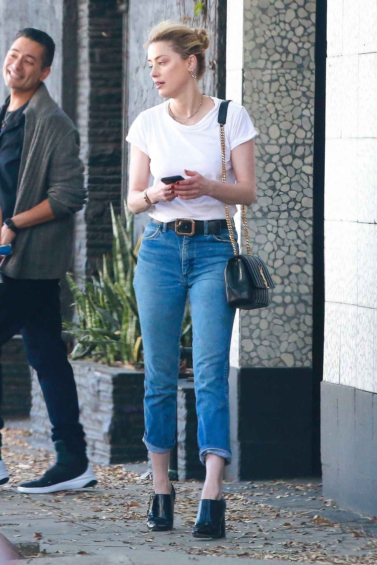 女優のアンバー・ハードは、白シャツにストレートデニムを合わせ、太めのベルトマークでボーイッシュな着こなし。袖をゆるくまくって、こなれて見せたのがポイント。