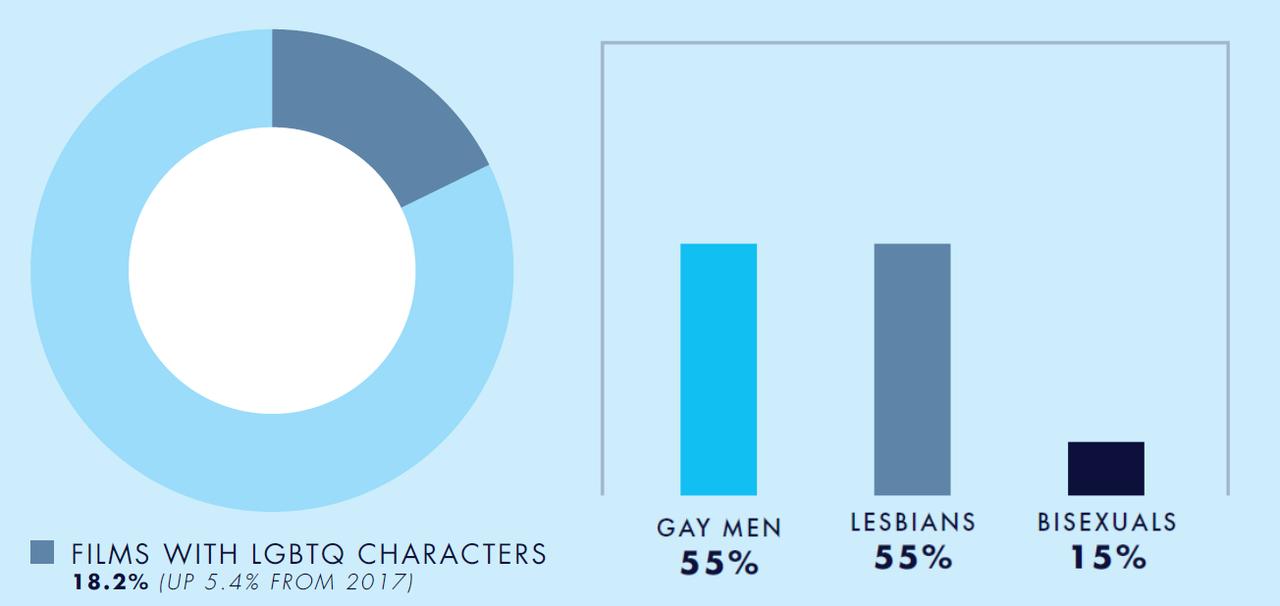 まず、2018年に公開された110本の映画のうち20本にLGBTQ₊キャラクターが登場した。全体の18.2%にあたるこの数はGLAADの統計が始まって以来2番目に高い数値で、前年より5.4%アップした。さらにこれまでの統計では映画に登場するLGBTQ+のキャラクターは白人のゲイ男性が過半数を占めていたが、今年は統計が始まって以来初めてゲイとレズビアンの比率が平等に。一方で、バイセクシャルは約15%(映画3本)という水準を変わらず維持しており、トランスジェンダーのキャラクターにいたっては前年と同じくゼロという結果となった。