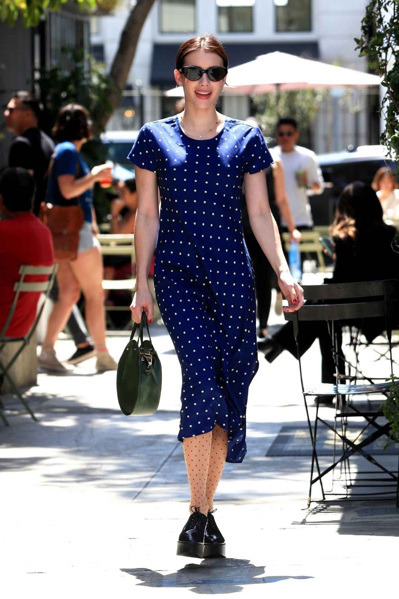ガーリーなスタイルが得意な女優のエマ・ロバーツは、ネイビーにスモールドットがプリントされたReformationのワンピースを愛用。