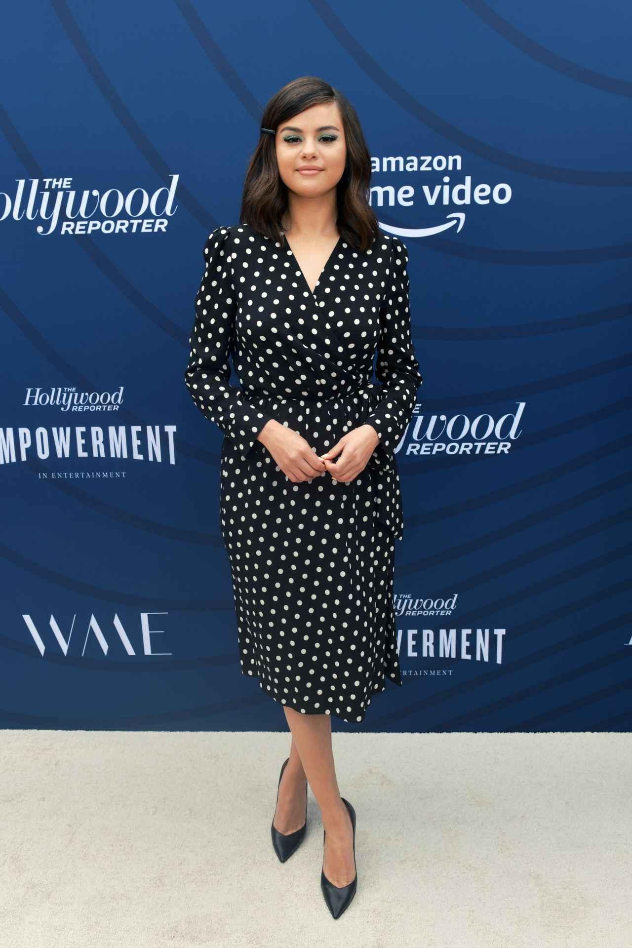 ブラック×ホワイトのクラシカルなCelineのドットプリントのワンピースを着用した世界的セレブのセレーナ・ゴメス。